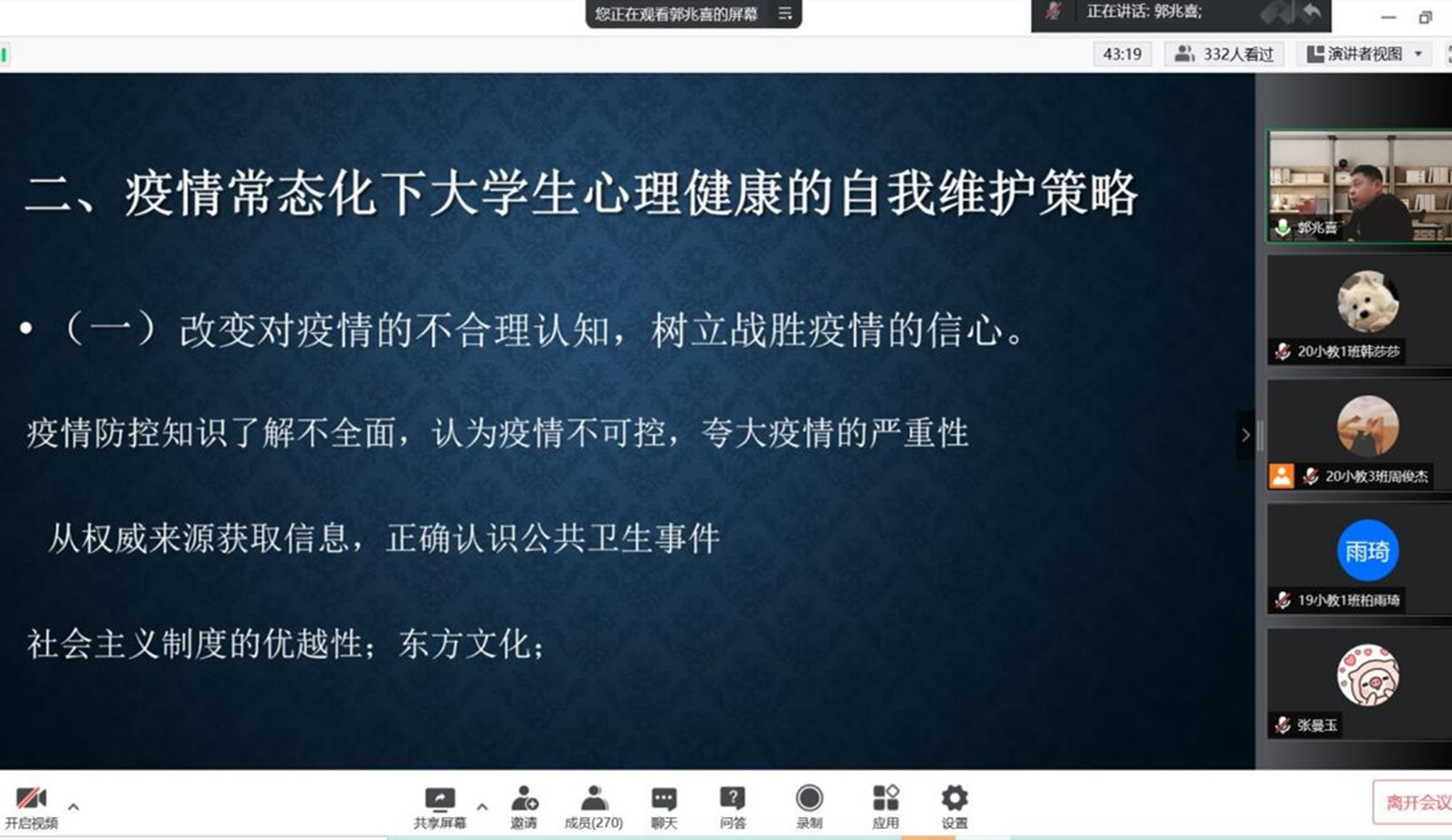 讲座中,郭兆喜结合当下严峻的疫情形势,分析了大学生产生心理健康问题的原因并提出相应的解决方法,并从多方面为同学们讲解大学生心理健康的自我维护策略。他希望同学们要自觉学习相关法律知识,学会用法治思维看待问题,从而维护自己的合法权益。