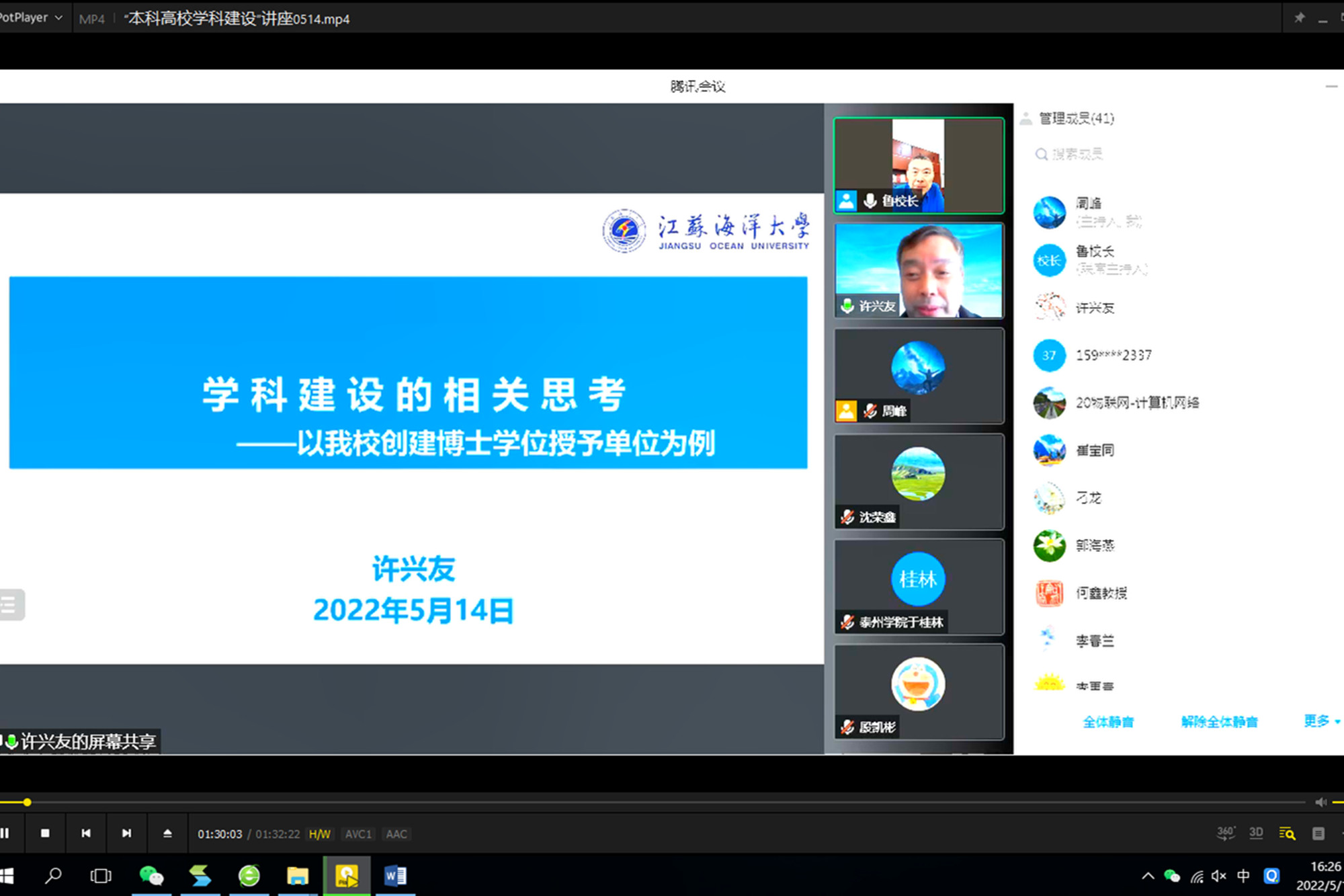 5月14日上午,校科研处邀请江苏海洋大学副校长、博士生导师许兴友教授,开展“本科高校学科建设”线上讲座。校党委常委、副校长鲁学军主持会议。科研处全体人员、各二级学院相关领导、重点学科带头人、学科骨干教师等50余人参加讲座。