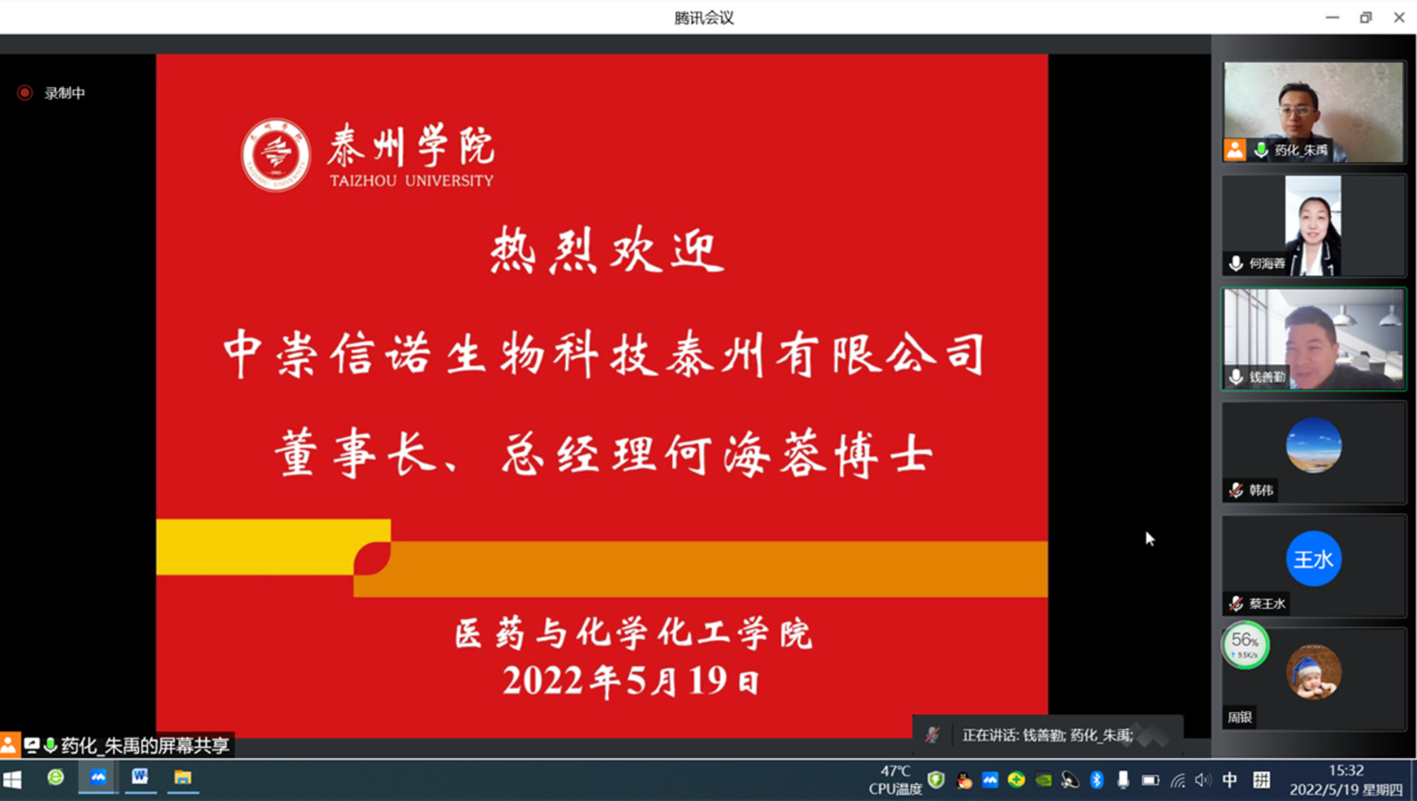 5月19日下午,中崇信诺生物科技泰州有限公司董事长、总经理何海蓉博士应邀为bat365师生作《中国医药城新“兽”药研发与评价“6G”中心建立与应用》的学术报告,报告由医药与化学化工学院院长助理朱禹主持。校科研处处长助理周银、医药与化学化工学院师生线上参加了此次学术报告。