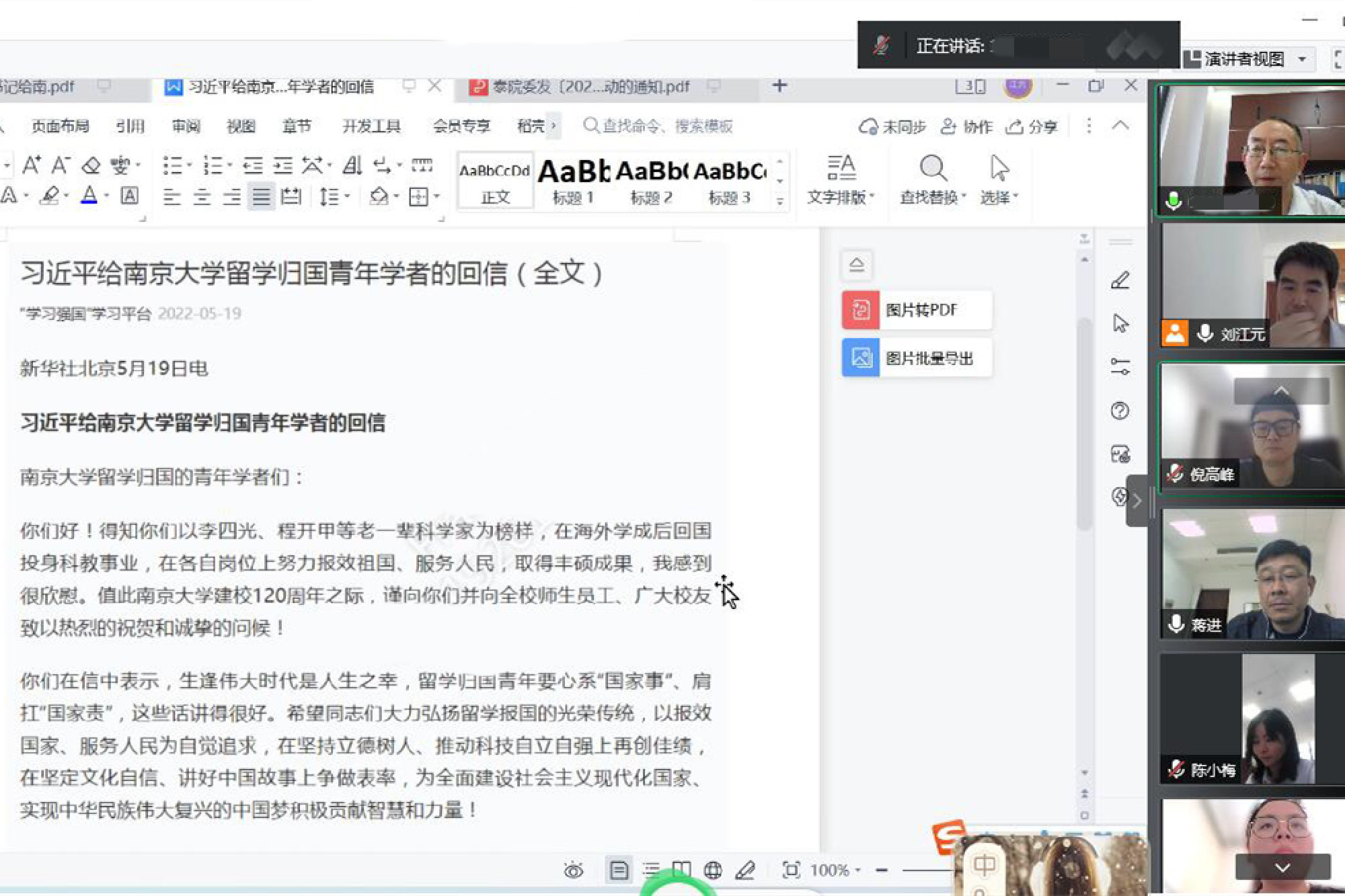 刘江元领学了《习近平给南京大学留学归国青年学者的回信》,并传达了省委教育工委、省教育厅关于学习回信精神的通知。全体中心组成员认真学习并谈了自己的学习体会。刘江元主要从“坚持不忘初心,建强教师队伍”角度汇报了音乐学院的师资队伍建设,强调学院要进一步发挥高校人才“蓄水池”作用,全方位培养引进用好人才,适应高校教师队伍建设改革的时代要求。党总支副书记、副院长陈小梅表示,作为高校思想政治教育工作者,我们在工作中要牢记“为党育人,为国育才”的使命,加强党史、国情教育,将爱国爱党的报国之志、浓厚的家国情怀、强烈的社会责任感融入立德树人的全过程,着力培养以报效国家、服务人民为己任的社会主义建设者和接班人。倪高峰结合自身引进到学校工作以来,积极利用学术讲座、学术会议以及音乐创作等方式宣传bat365在线中国官网登录入口、讲好泰院故事谈了学习心得。蒋进从自身进入音乐学院工作以来的真实感受出发,深入谈了对“学高为师,身正为范”内涵的理解。丁加琪从学生就业创业角度谈了人才培养工作的重要意义,表示时刻牢记党员的神圣使命,切实为毕业生做好服务工作。