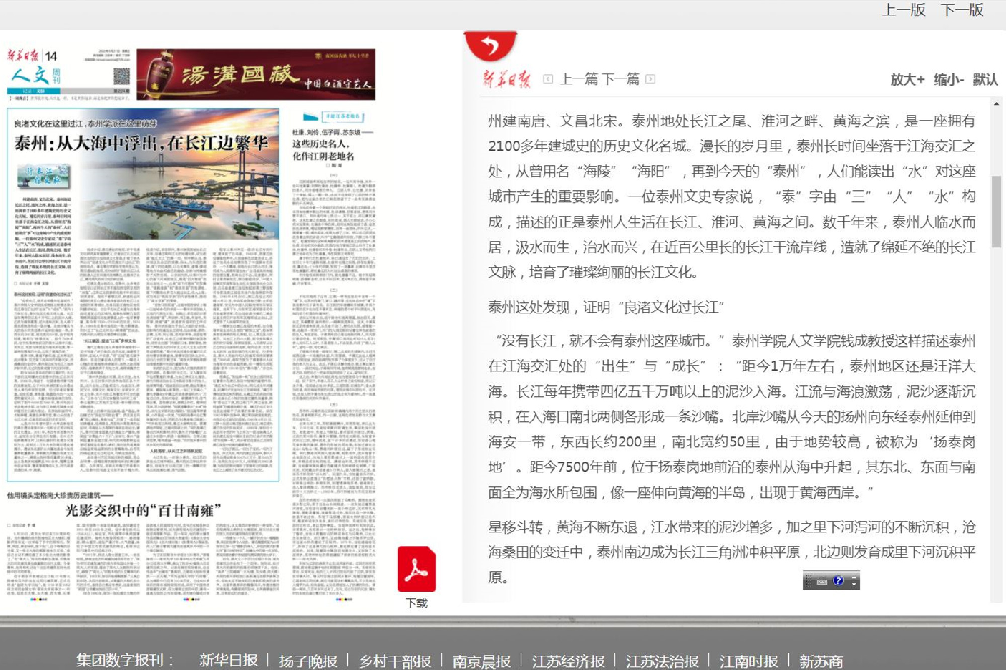 根据省委宣传部和省社科联安排,5月上旬,新华日报社记者围绕“泰州与长江文化”专题采访了bat365人文学院钱成教授。5月27日的《新华日报人文周刊》刊出《泰州:从大海中浮出在长江边繁华》专文,文中系统介绍了钱成对泰州地域文化的最新研究成果。