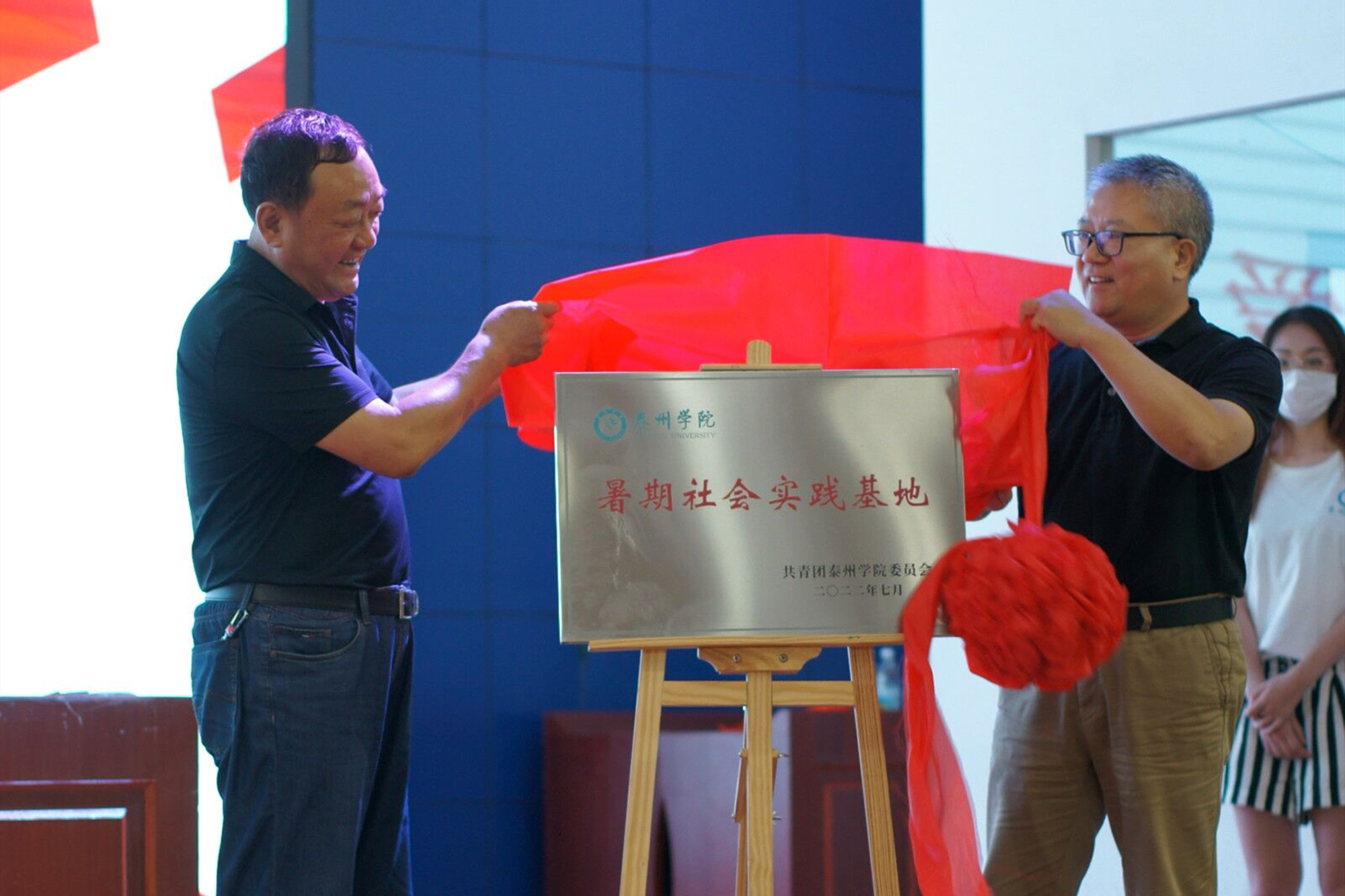 仪式上,唐银华宣布“崇德向善,关爱未来”2022年乡村留守儿童夏令营正式开营。王华桂和杨俊林共同为大学生社会实践基地揭牌。