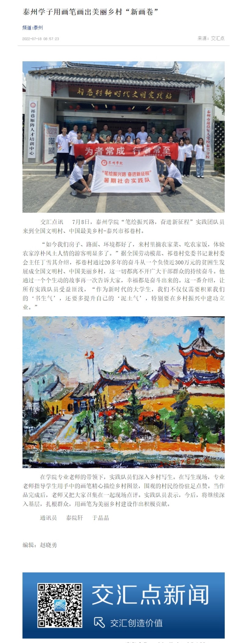 7月18日,《交汇点新闻》泰州频道报道bat365“笔绘振兴路,奋进新征程”实践团队在学院专业老师的带领下,深入祁巷村写生,用画笔为美丽乡村建设作出积极贡献。报道题为:《泰州学子用画笔画出美丽乡村“新画卷”》,链接:https://jnews.xhby.net/v3/waparticles/70/0/950oYAmeQJAHt7WN/1
