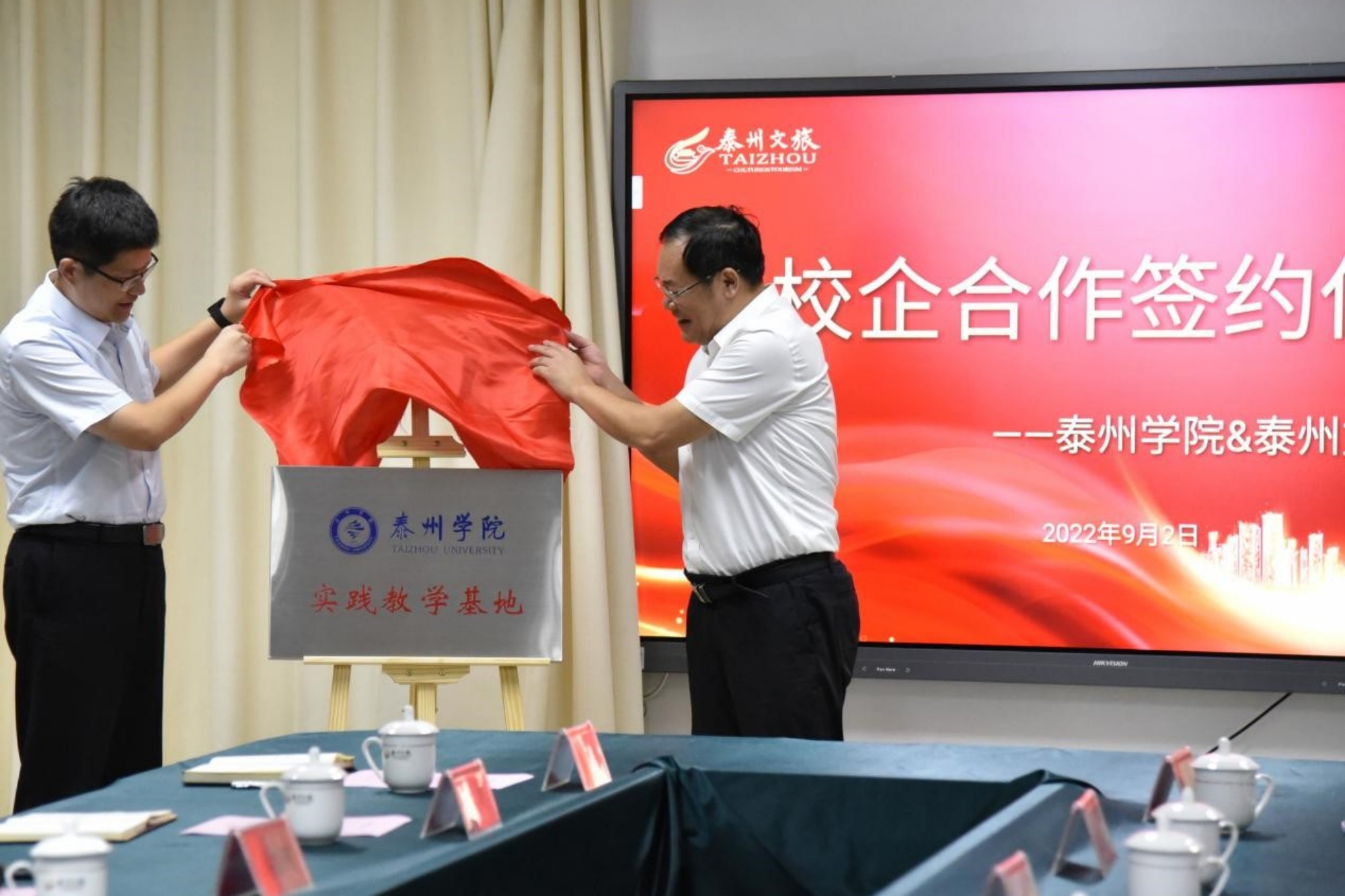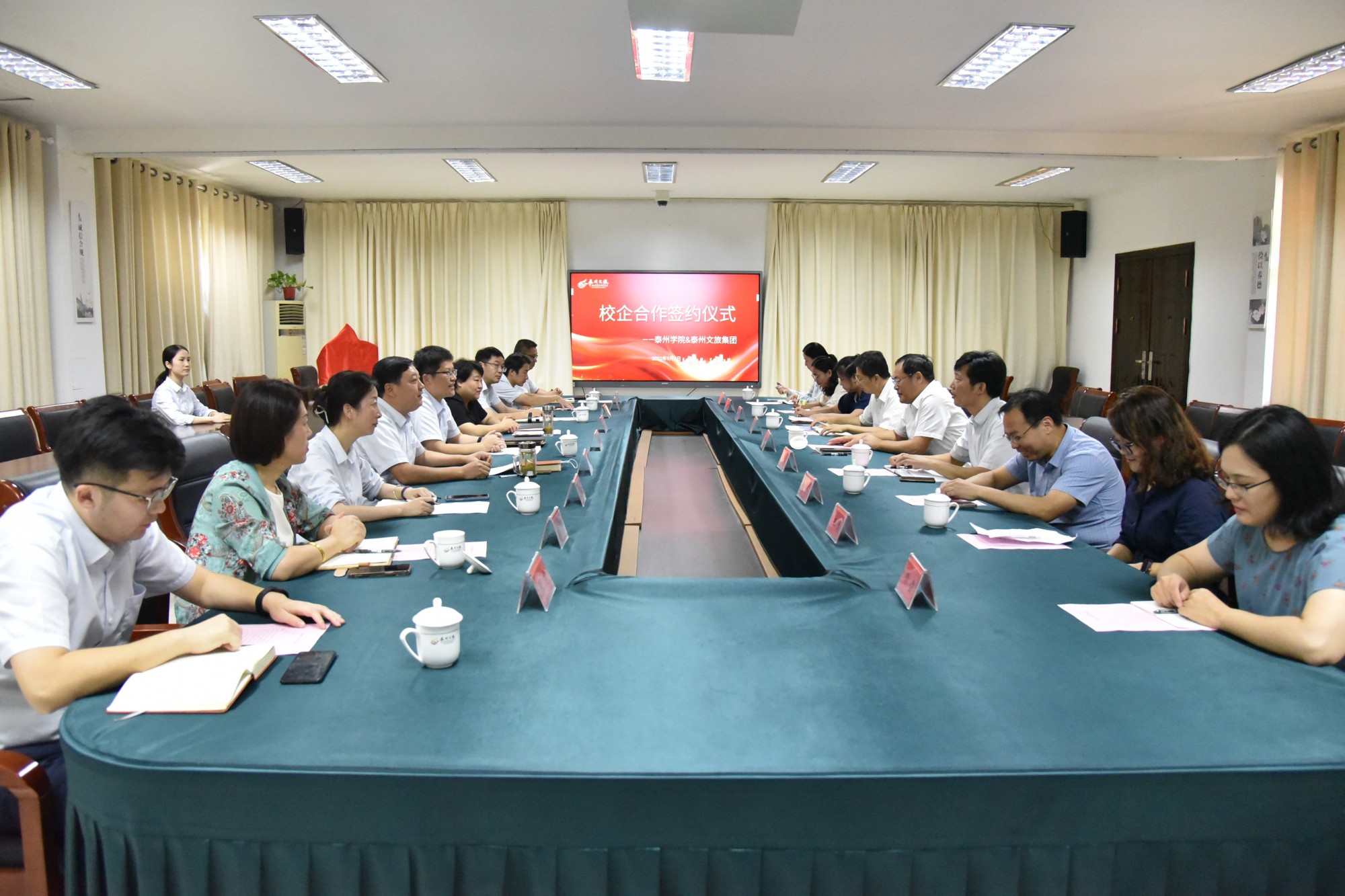9月2日下午,bat365与泰州文旅集团校企合作签约暨揭牌仪式在泰州市文旅集团会议室举行。校党委书记徐向明,泰州文旅集团党委书记、董事长翟文周,党委副书记、总经理王亮,经济与管理学院党支书记徐小兵、院长朱军等出席签约仪式。仪式由文旅集团党委委员、副总经理周建主持。