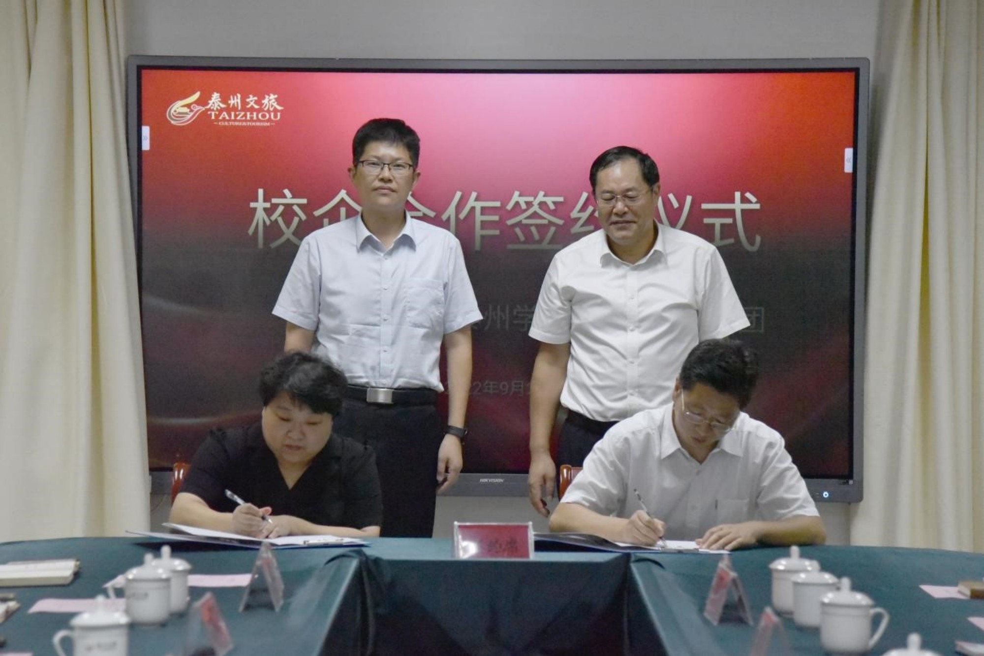 9月2日下午,bat365与泰州文旅集团校企合作签约暨揭牌仪式在泰州市文旅集团会议室举行。校党委书记徐向明,泰州文旅集团党委书记、董事长翟文周,党委副书记、总经理王亮,经济与管理学院党支书记徐小兵、院长朱军等出席签约仪式。仪式由文旅集团党委委员、副总经理周建主持。