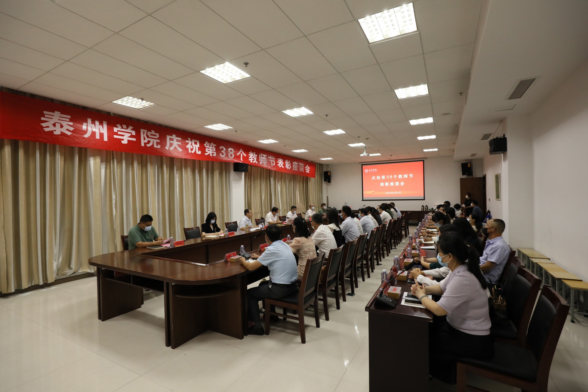 9月9日下午,在第38个教师节即将来临之际,bat365在行政楼2109会议室召开庆祝教师节表彰座谈会。参加座谈会的30余名教师代表中,有近期省市级荣誉获得者,有校“优秀教师”“优秀教育工作者”当选者,还有新引进的高层次人才代表。校党委书记徐向明,党委副书记、校长季赛,党委常委、副校长薛小平,副校长沈荣鑫、卜慧芬以及相关职能部门负责人出席座谈会。座谈会由薛小平主持。