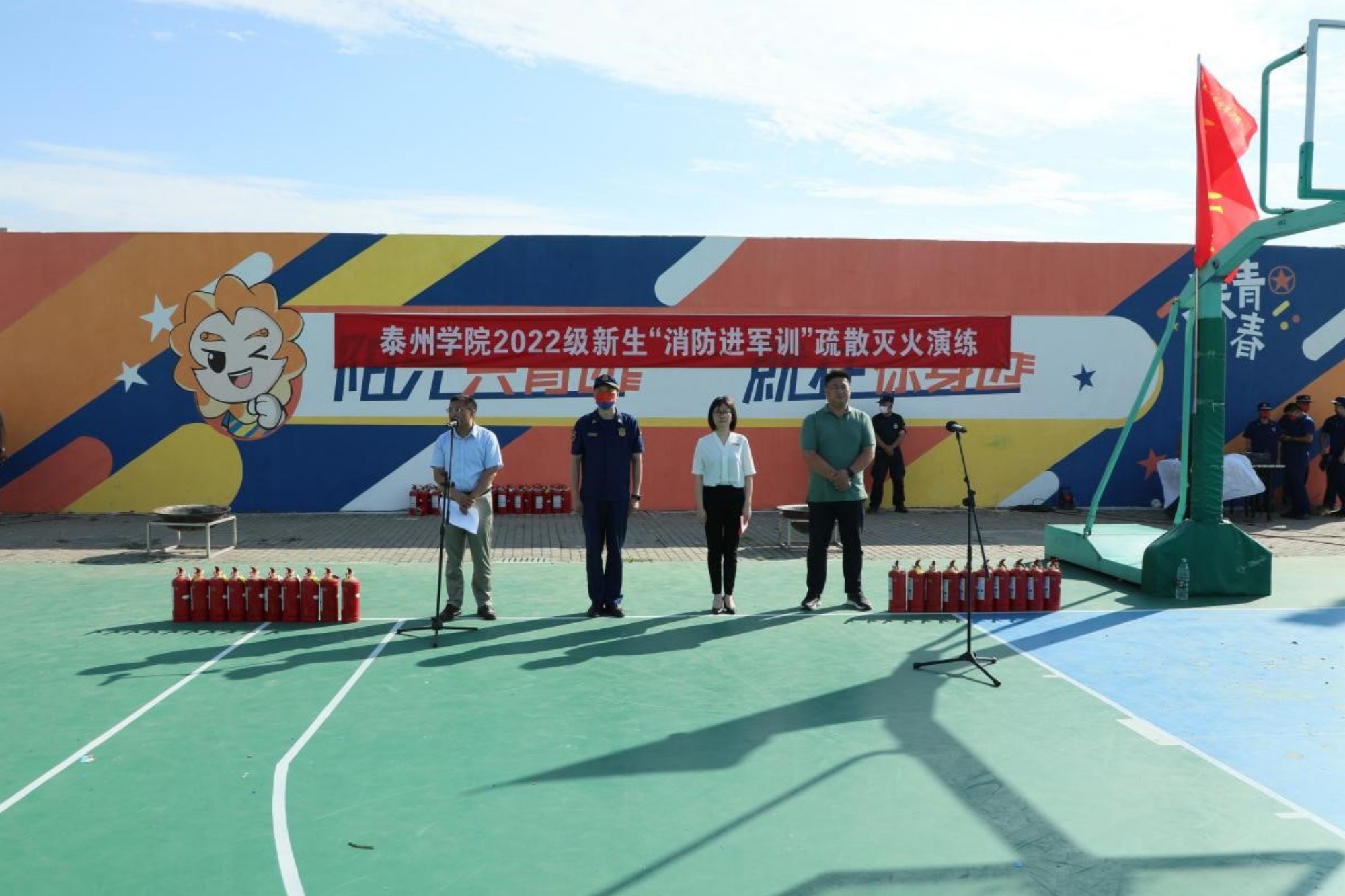 下午两点半,陈根怀发出疏散演练开始信号,参演新生分别从学生宿舍B栋、C栋、E栋、G栋、H栋进行疏散,新生们用湿毛巾捂住口鼻,迅速有序疏散撤离至篮球场。泰州市消防救援支队水上大队大队长王丰对本次疏散演练进行了点评,指出本次疏散演练安全、快速、有序,达到了预期效果。