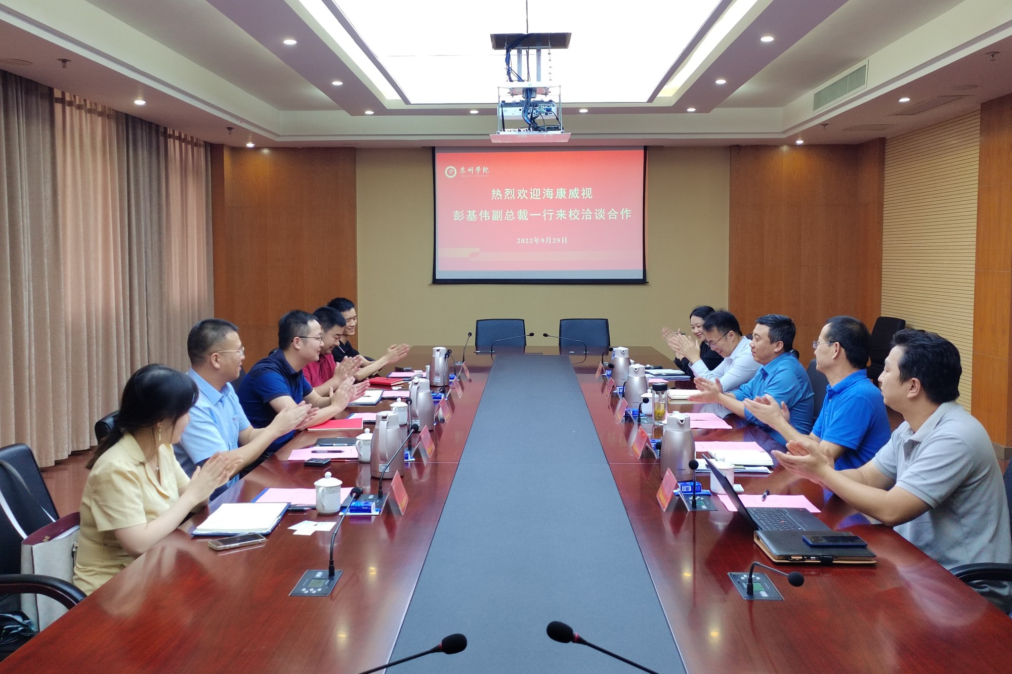 9月29日下午,杭州海康威视数字技术股份有限公司江苏业务中心副总裁彭基伟一行5人来校洽谈合作,洽谈会在D1505会议室举行。党委副书记、校长季赛出席会议,信息工程学院、保卫处、信息化中心负责人参加会议。