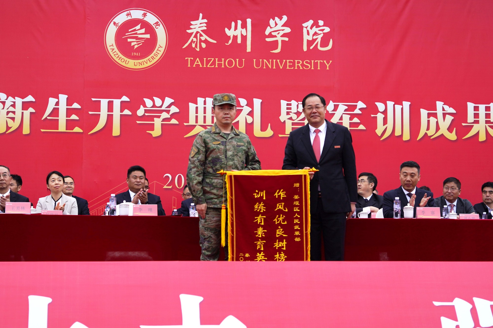 在庄严的升国旗仪式后,活动正式开始。新生分别表演了分列式、队列会操、擒敌拳、匕首操、应急棍等项目。他们军姿严整、动作整齐、精神饱满,与现场数百面迎风飘扬的红旗交相辉映,充分展示了启航新征程的泰院人的坚定信念和磅礴力量。校党委书记徐向明代表学校向姜堰区人民武装部赠送锦旗并向承训教官赠送纪念章,感谢姜堰区人民武装部多年来对bat365军训工作的支持。