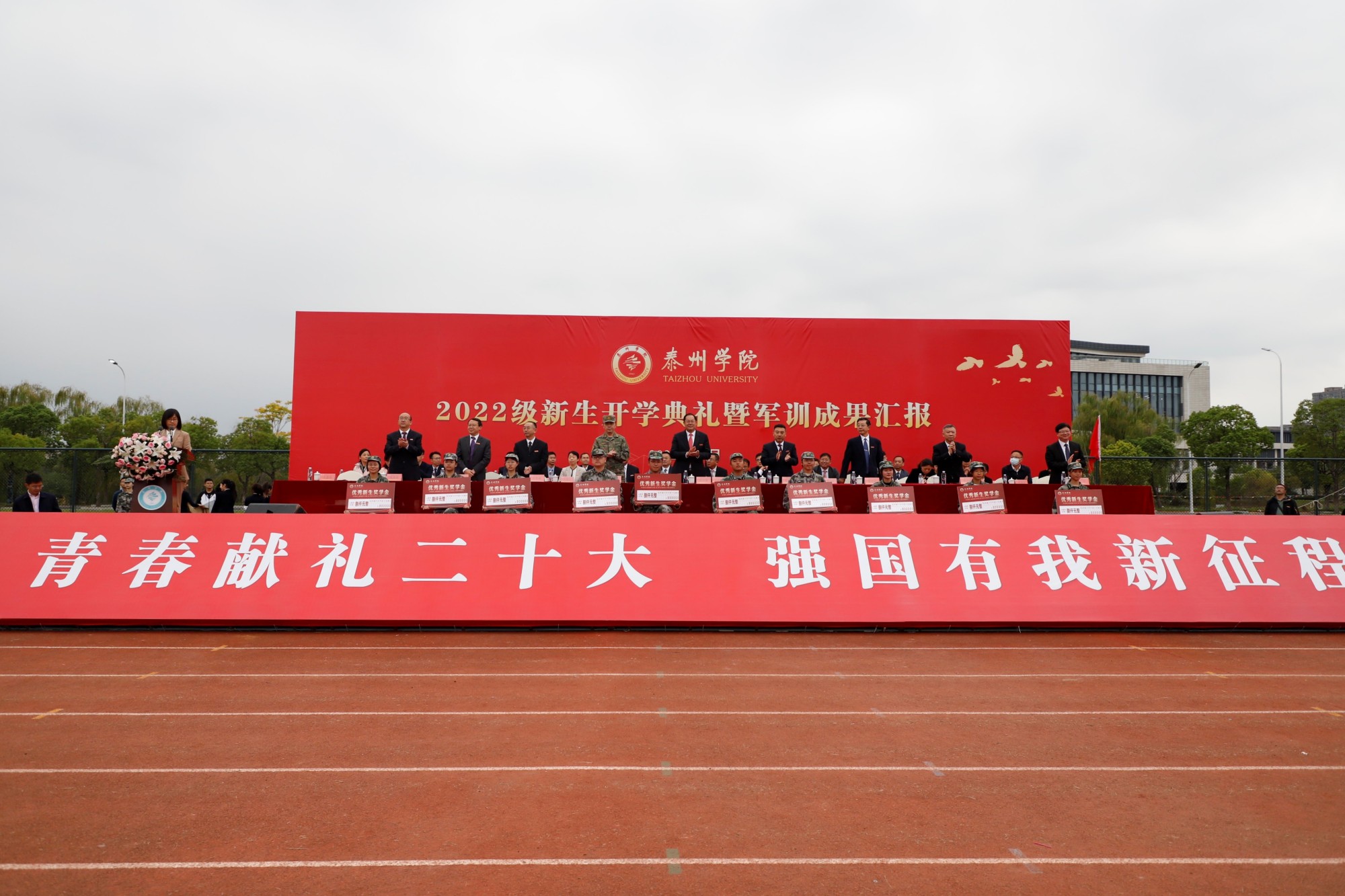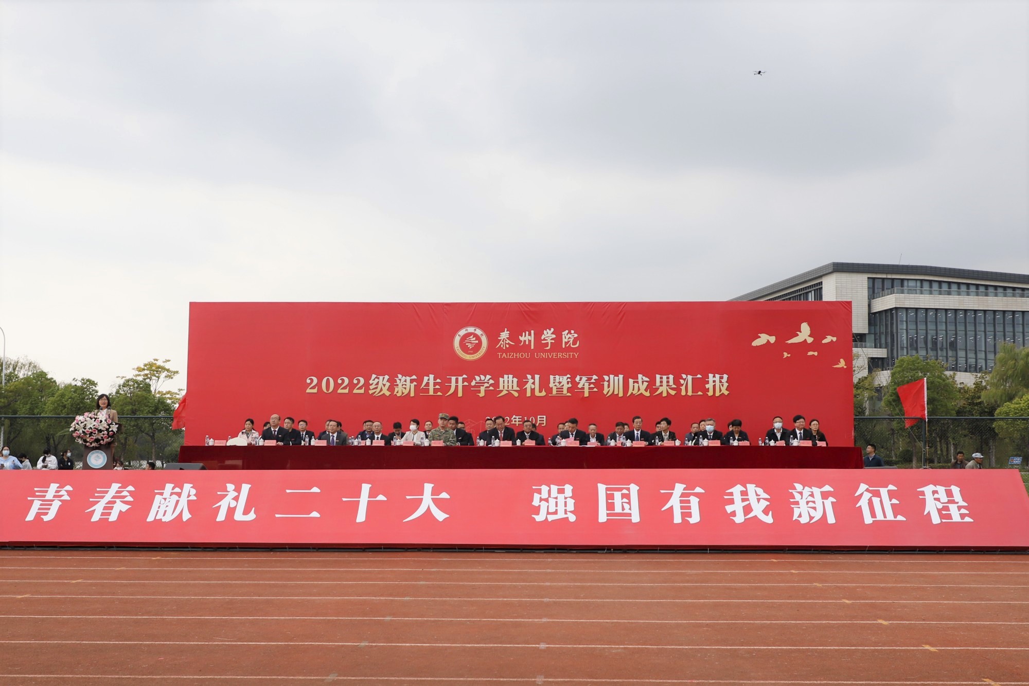 青春献礼二十大,强国有我新征程。在bat365第三次党员代表大会胜利闭幕之时,在全校师生用实际行动迎接党的二十大胜利召开之际,10月7日下午,2022级新生开学典礼暨军训成果汇报大会在济川校区运动场隆重举行。校领导班子全体成员,姜堰区区委常委、人民武装部政委李瑾出席活动,学校相关职能部门负责人、各二级学院负责人、带训教官、全体新生辅导员和2022级新同学参加活动。活动由校党委常委、副校长卜慧芬主持。