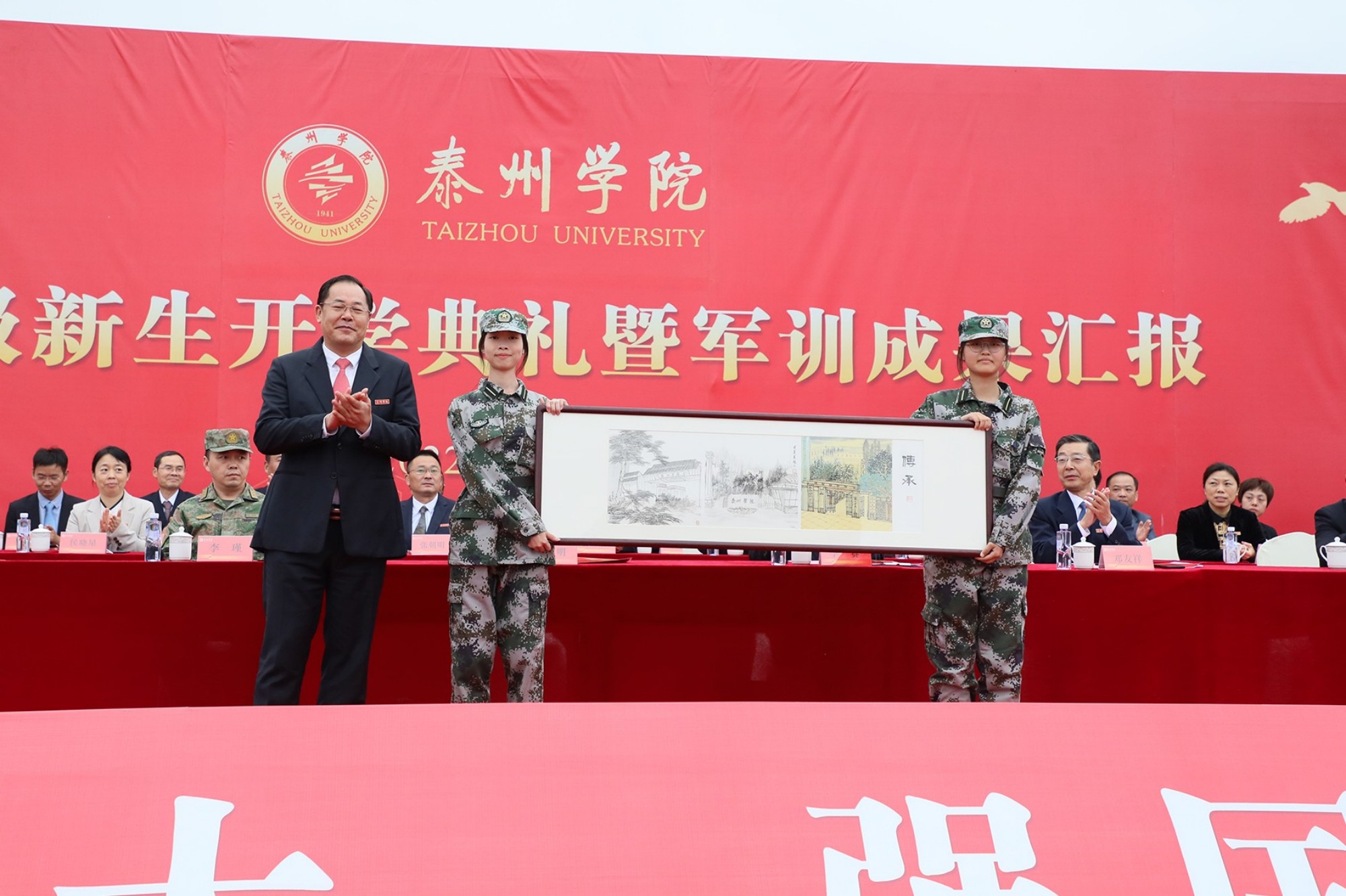 开学典礼环节,首先举行了佩戴校徽仪式和新生入学宣誓仪式,全体校领导为新生代表佩戴校徽。徐向明向新生赠送了由美术学院刘晨韵、杨新林二位老师合作完成,象征泰院精神的画作《传承》,勉励新一代泰院人牢记使命担当,从泰院启航,踏上新征程,谱写新华章。