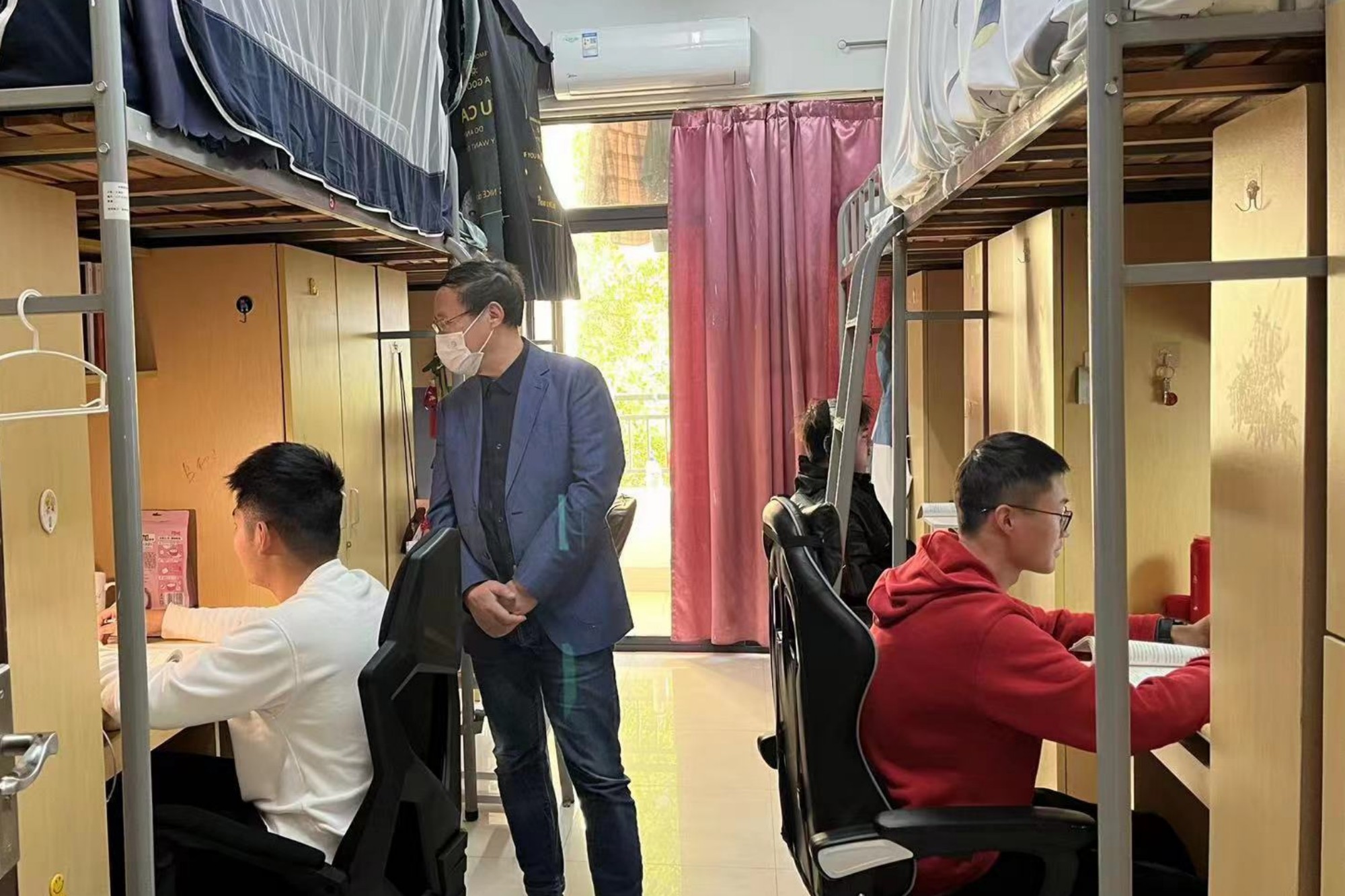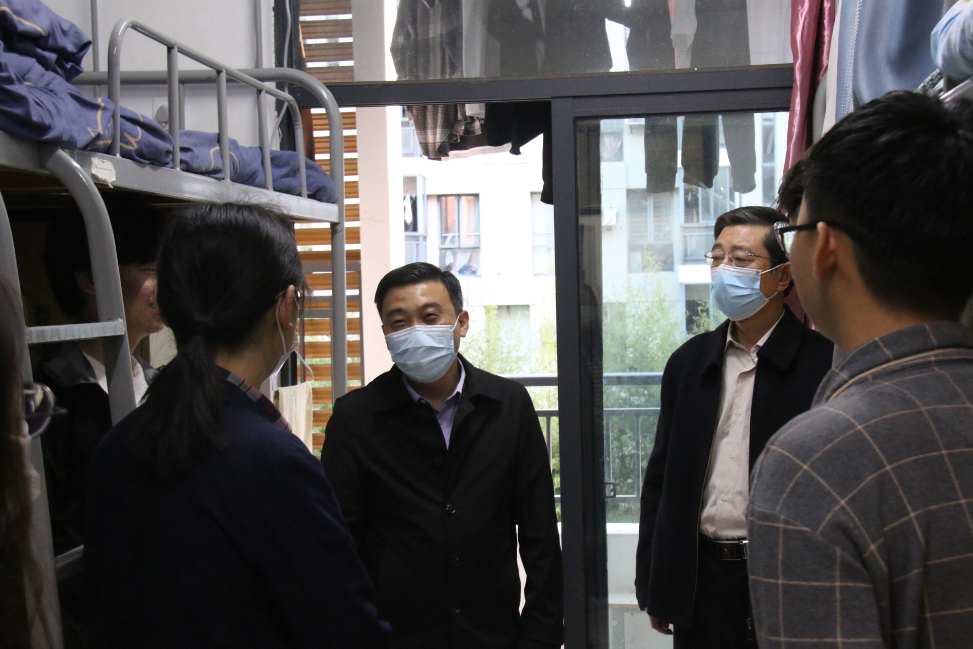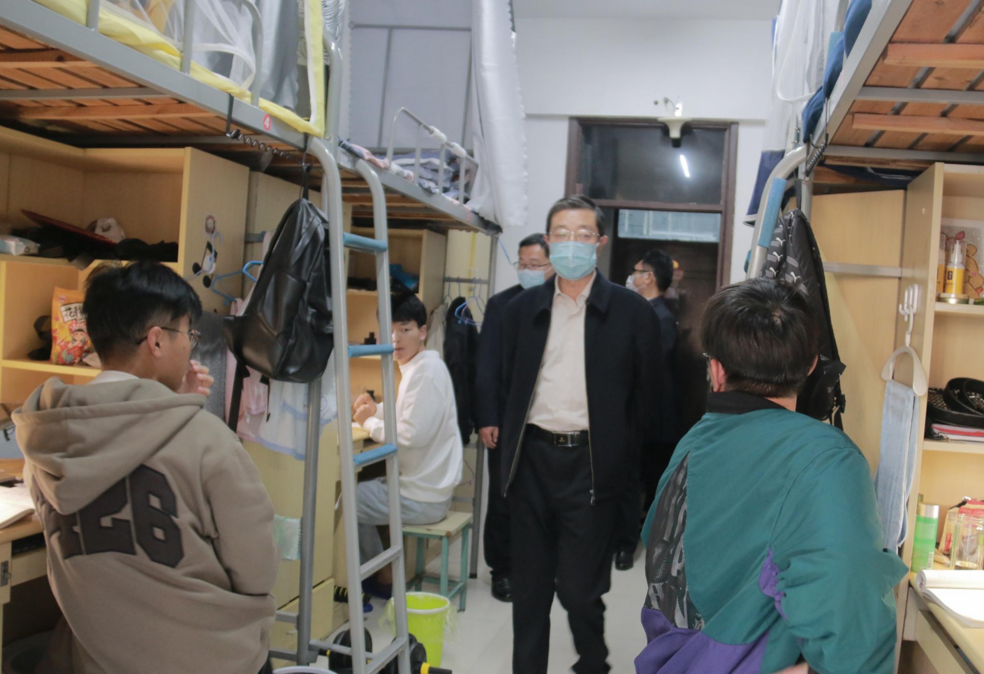 在走访宿舍的过程中,校领导与同学们进行了近距离、亲切的交流,详细了解同学们的身心状况和近期学习生活情况,提醒大家遵守疫情防控规定,做好个人防护,保持宿舍卫生,加强体育锻炼,注意劳逸结合,鼓励大家及时调整状态,做好合理规划,保持积极健康、乐观向上的生活态度。