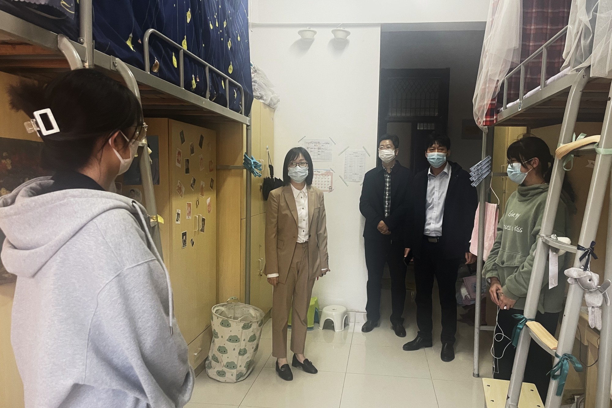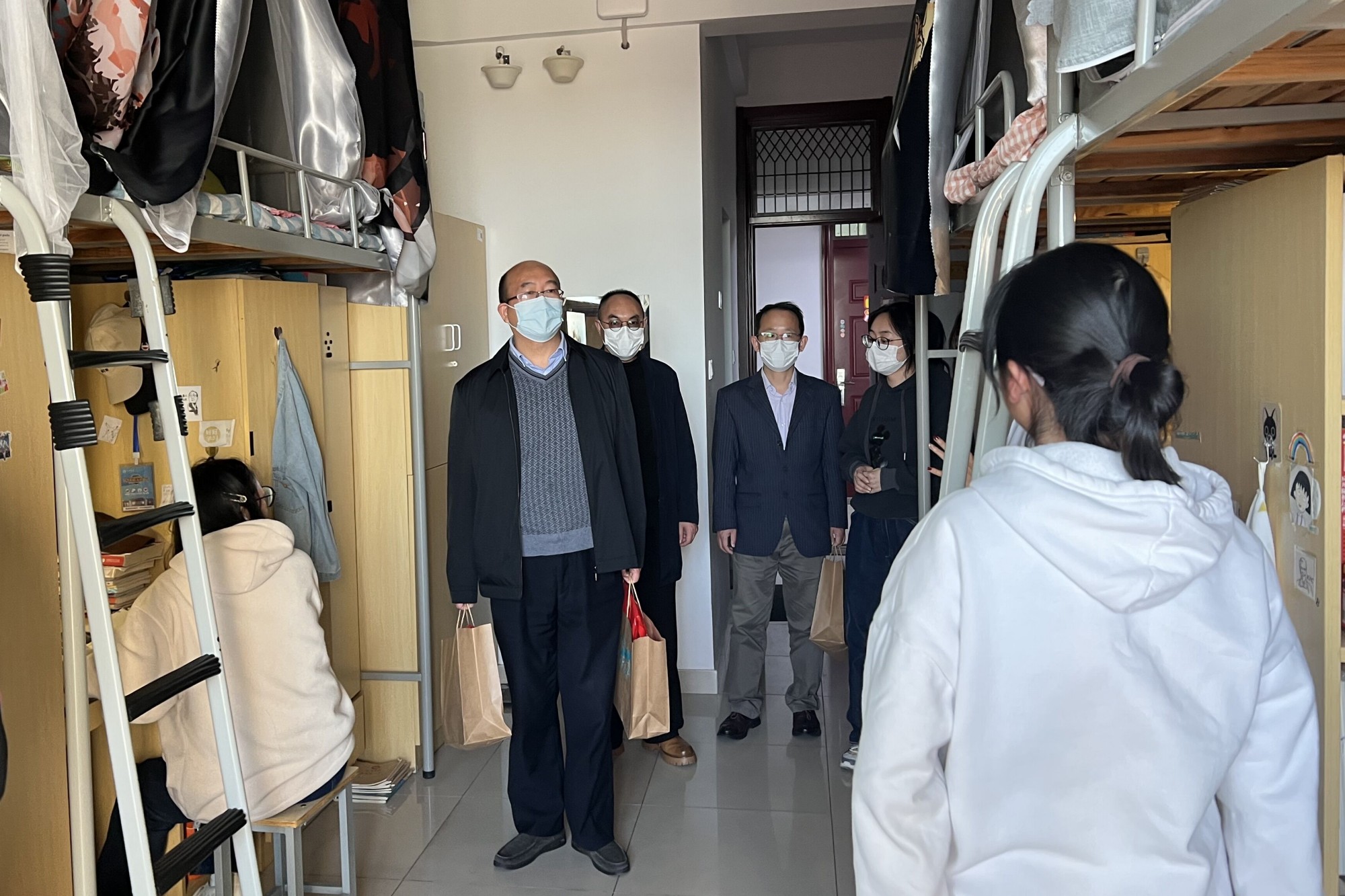 海陵区实行静态管理以来,学校启动疫情防控应急管理机制,实行AB角轮岗住校办公,全力保障师生身心健康,维护校园安全稳定。为了全面了解近期学生学习生活情况,切实解决学生遇到的困难和问题。近日,A岗校领导党委副书记、校长季赛,党委副书记邓友祥,党委常委、副校长薛小平,党委常委、副校长沈荣鑫,党委常委、副校长卜慧芬率领各二级学院及相关部门负责人、辅导员相继走访学生宿舍,为同学们送去关心和问候。