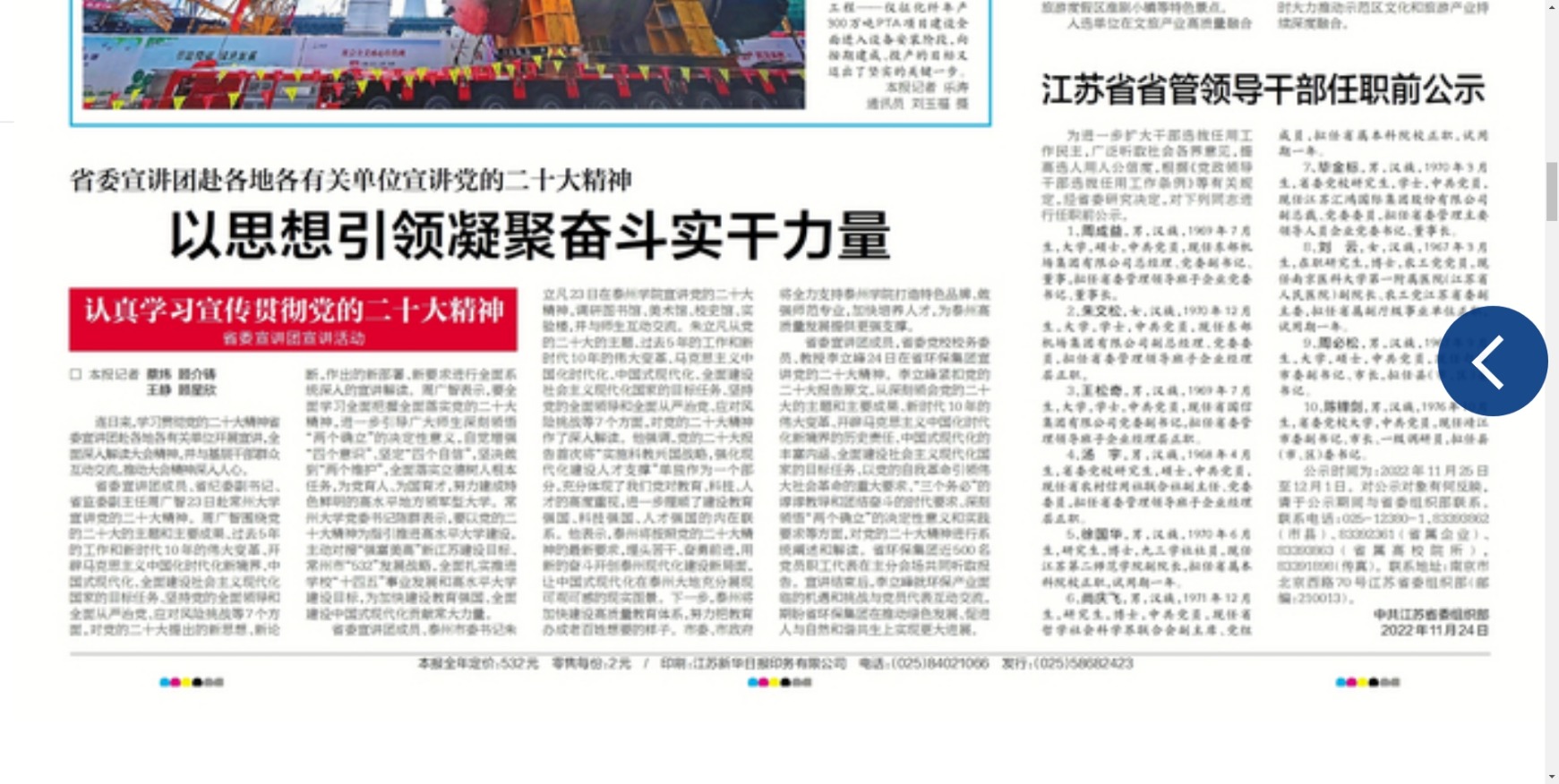 《新华日报》11月25日报道省委宣讲团成员、泰州市委书记朱立凡到bat365宣讲党的二十大精神,题为《省委宣讲团赴各地各有关单位宣讲党的二十大精神 以思想引领凝聚奋斗实干力量》,链接http://newspaper.xhby.net/?act=layout&layountIndex=1&date=20221125&siteID=2&id=1
