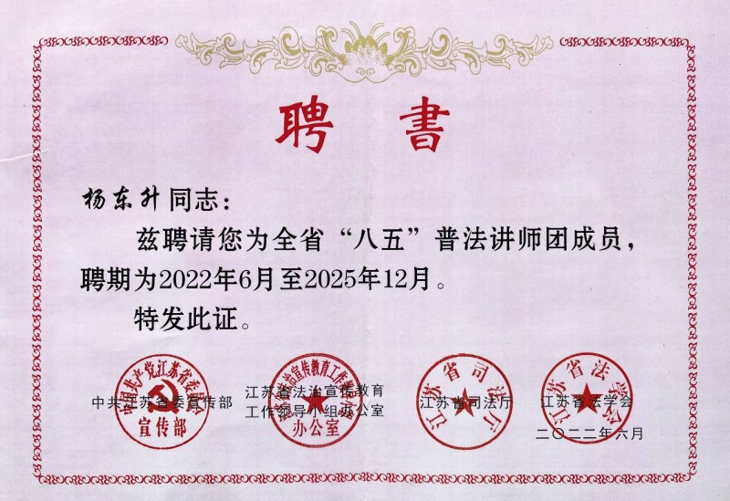 根据江苏省委宣传部、省法宣办、省司法厅、省法学会《关于推荐全省“八五”普法讲师团成员的通知》(苏司电〔2021〕77号)精神,省法宣办会同省法学会按照政治立场坚定、法律基础扎实、热衷普法工作等要求,兼顾学术专长、社会知名度等条件,遴选出315名全省“八五”普法讲师团成员。人文学院杨东升博士获聘全省“八五”普法讲师团成员,聘期从2022年6月至2025年12月。