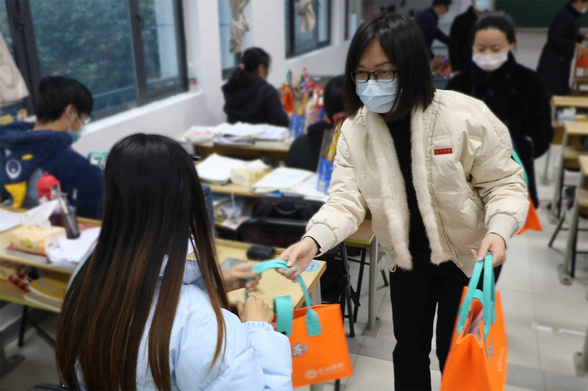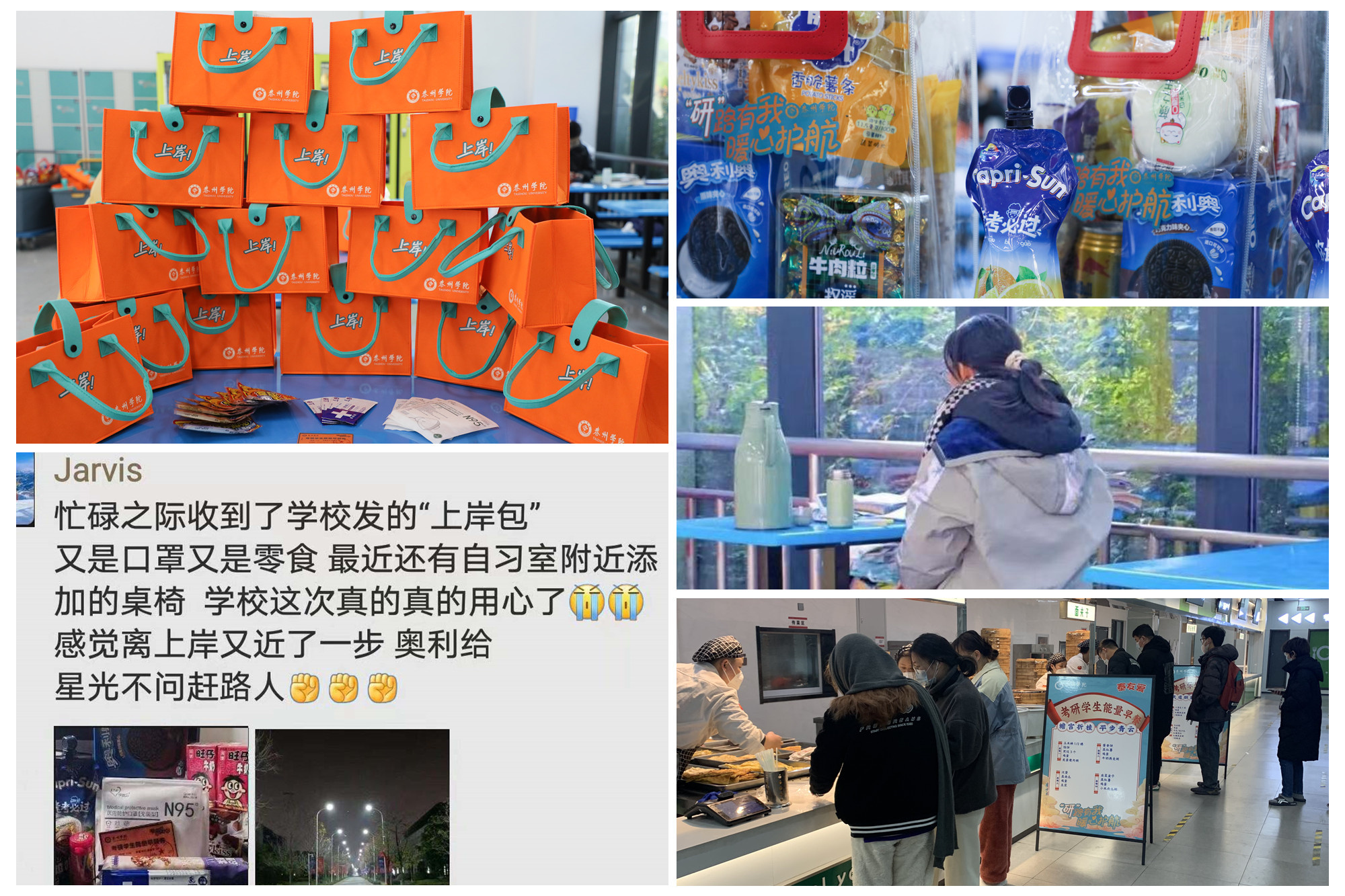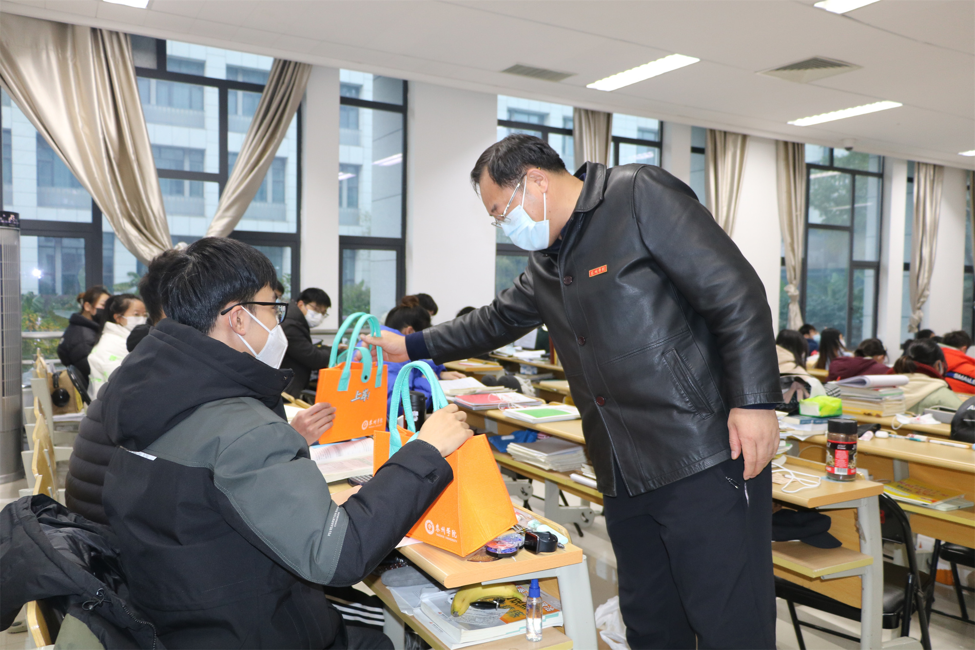 徐向明希望同学们在冲刺阶段坚定信念、保持热情、全力以赴、坚持到底,并送上泰院学子专属的“上岸”包。包里为考研学生准备了N95口罩、消毒湿巾、爱心早餐券、暖宝宝等物资。他提醒考生们,每个人都是自己健康的第一责任人,在冲刺的关键时期,大家一定要注意饮食、注意保暖,坚持佩戴口罩,确保不因身体因素影响复习备考。