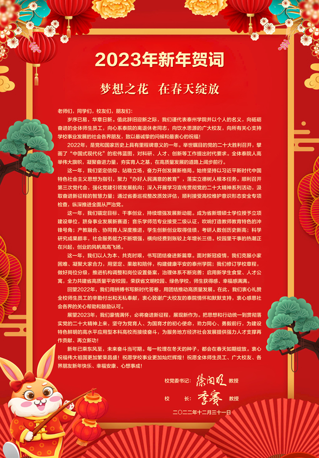 梦想之花 在春天绽放——校党委书记徐向明、校长季赛2023年《新年贺词》