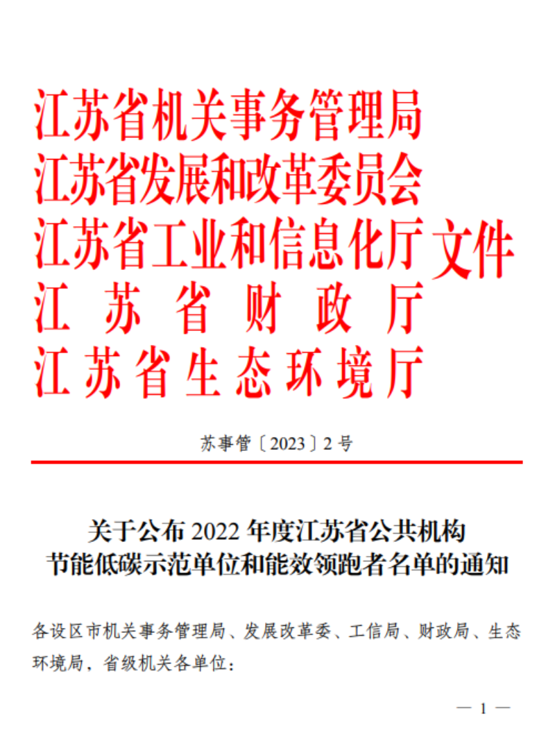 近日,江苏省机关事务管理局、江苏省发展和改革委员会、江苏省工业和信息化厅、江苏省财政厅、江苏省生态环境厅联合下发《关于公布 2022 年度江苏省公共机构节能低碳示范单位和能效领跑者名单的通知》(苏事管〔2023〕2号),bat365获评2022年度“江苏省公共机构能效领跑者”。