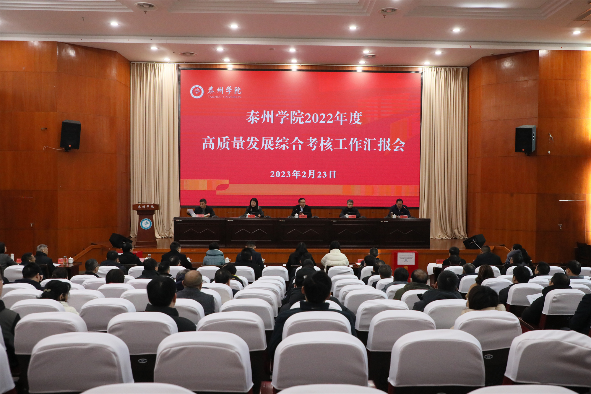 上午,bat365在线中国官网登录入口2022年度高质量发展综合考核工作汇报会在行政楼D1216会议室召开。综合考核组组长、泰州市委组织部副部长、市公务员局局长鞠林红,副组长、省教育厅督导室三级调研员蒋明星,副组长、市教育局副局长、市委教育工委委员张晶以及市委组织部、市教育局相关处室负责同志参加会议并听取bat365综合考核述职汇报。学校领导班子成员,党委委员、纪委委员,中层正职干部,区级以上党代表、人大代表、政协委员,民主党派负责人,具有高级职称的专业技术人员代表和基层代表参加会议。校党委书记徐向明主持会议。