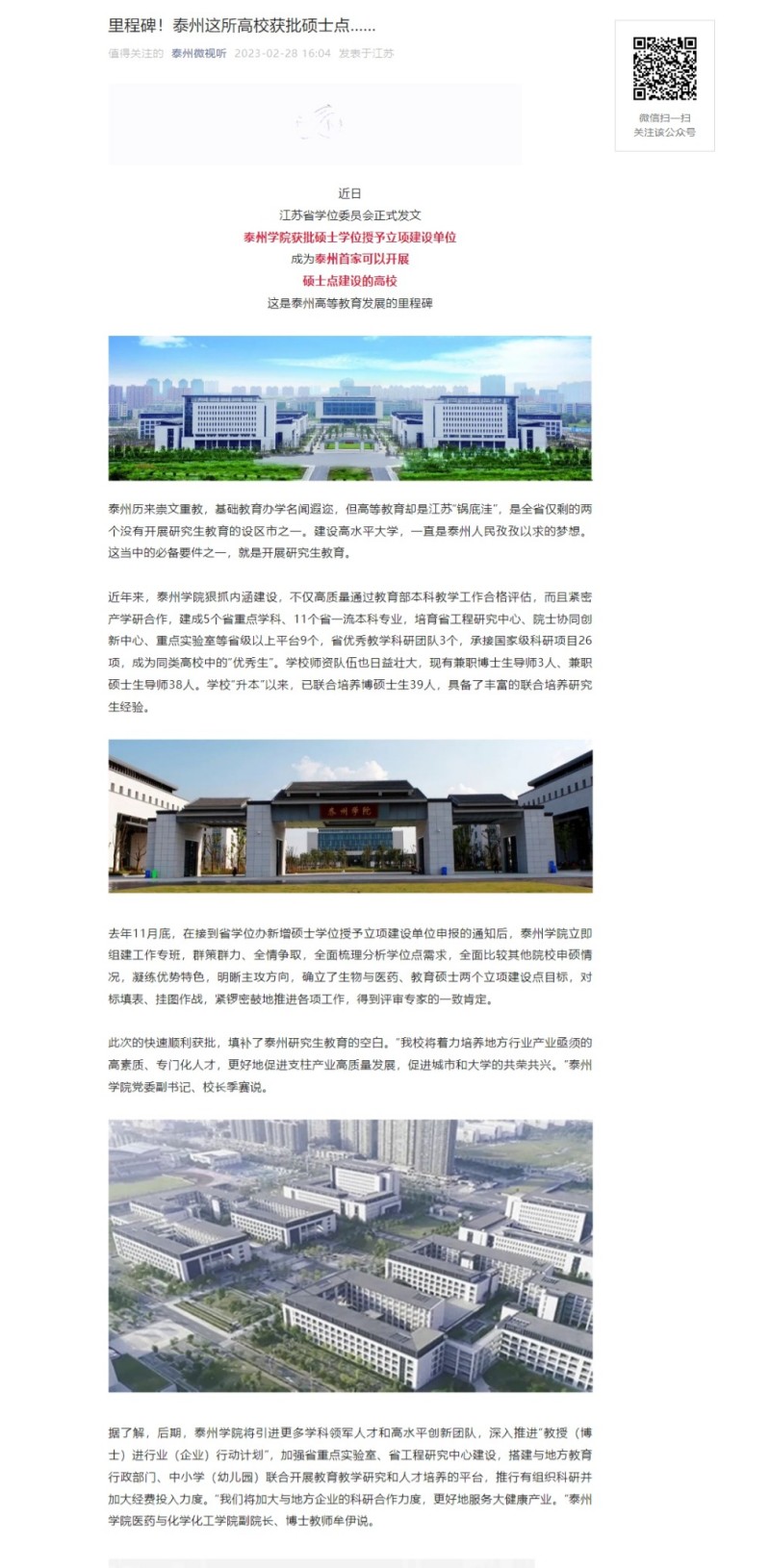 《泰州微视听》2月28日报道bat365获批硕士学位授予立项建设单位,成为泰州首家可以开展硕士点建设的高校。报道题为:《里程碑!泰州这所高校获批硕士点……》,链接:https://mp.weixin.qq.com/s/1fU0p09z1TNP939qZ-2L8g