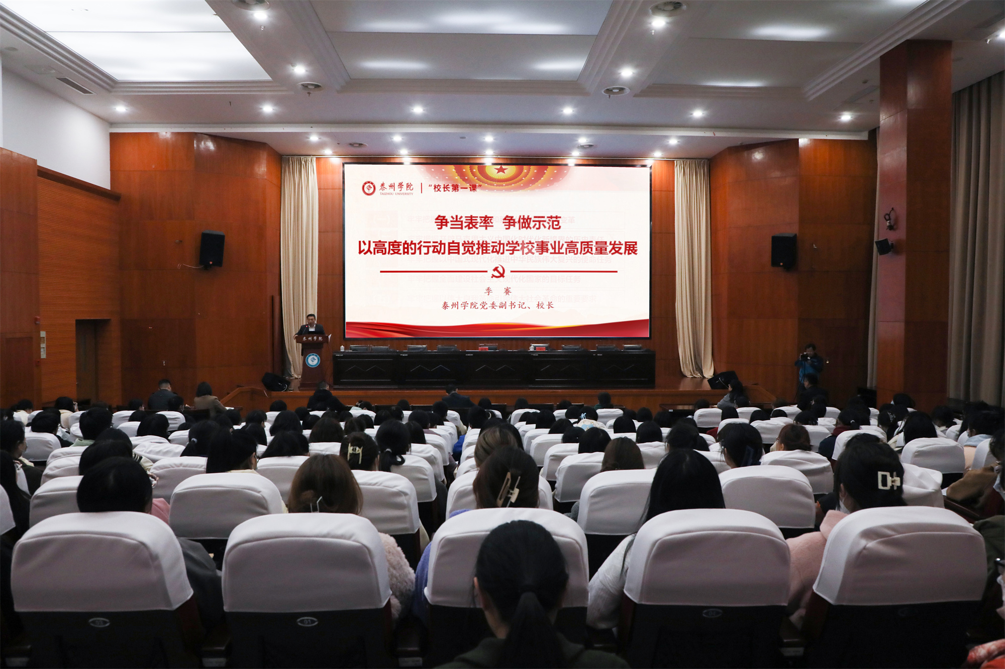 3月16日,校党委副书记、校长季赛以《争当表率 争做示范 以高度的行动自觉推动学校事业高质量发展》为题为学生讲授“开学第一课”,鼓励青年学子坚定理想信念,砥砺前行争做时代栋梁。党委常委、副校长卜慧芬主持活动,200余名学生代表现场聆听。