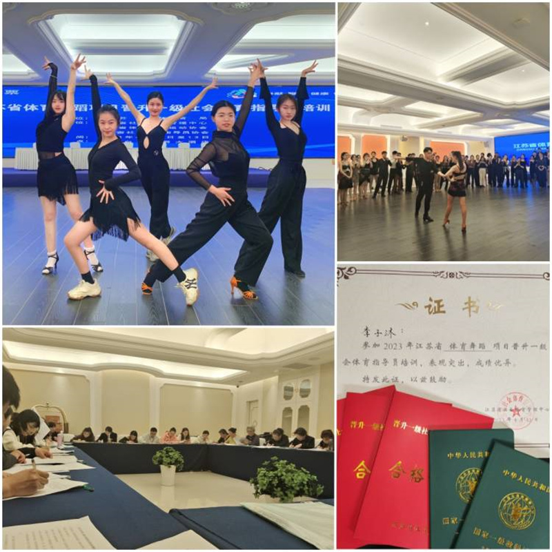 由江苏省体育局主办,江苏省社会体育管理中心、江苏省体育舞蹈运动协会、江苏省社会体育指导员协会联合承办的2023年晋升体育舞蹈国家一级教师与江苏省体育舞蹈项目晋升一级社会指导员考核,历时4天,于4月13日在南京白金汉爵大酒店落下帷幕。bat36521级音乐学2班李子沐、施诗两位同学获得体育舞蹈国家一级教师与一级社会指导员资格,21音乐学1班苗若莹、22学前转本2班刘琼琼、22学前转本3班黄晨阳三位同学获得江苏省体育舞蹈项目一级社会指导员资格。
