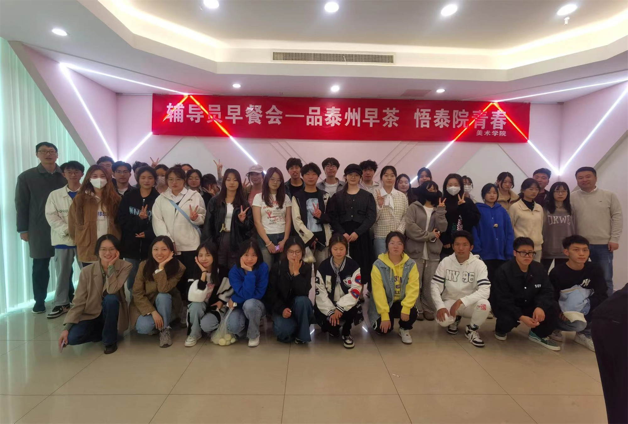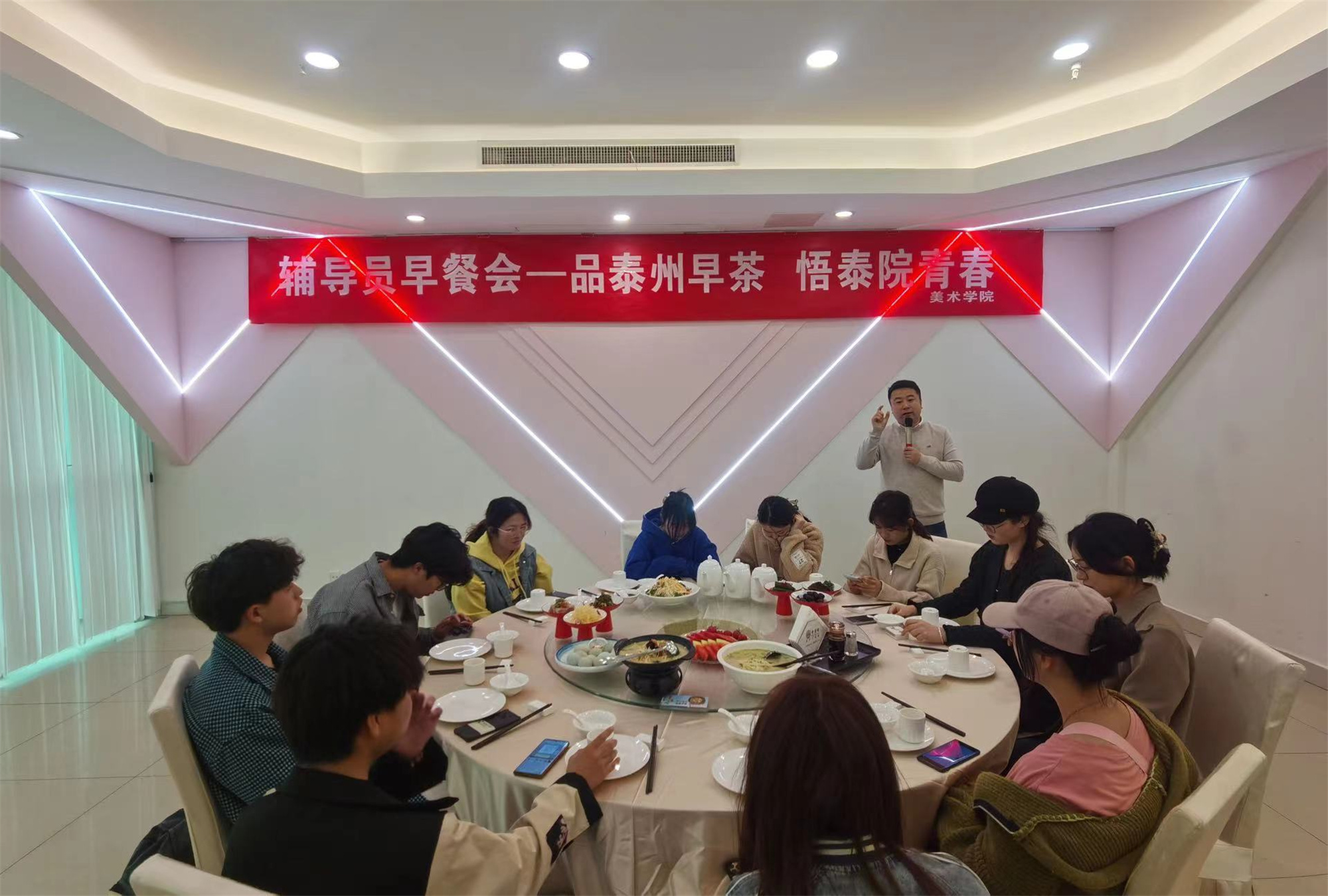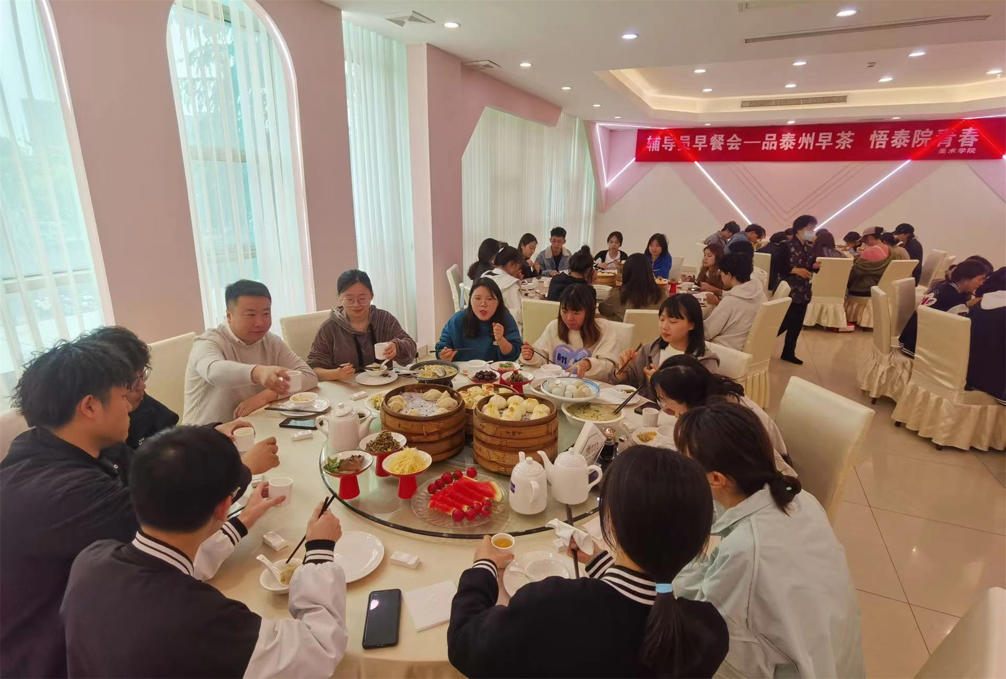4月29日上午,“五一”国际劳动节来临之际,美术学院举办“品泰州早茶,悟泰院青春”辅导员早餐会。学院全体辅导员与各年级学生代表50名共进早餐,面对面听取大家对学生工作意见及建议。