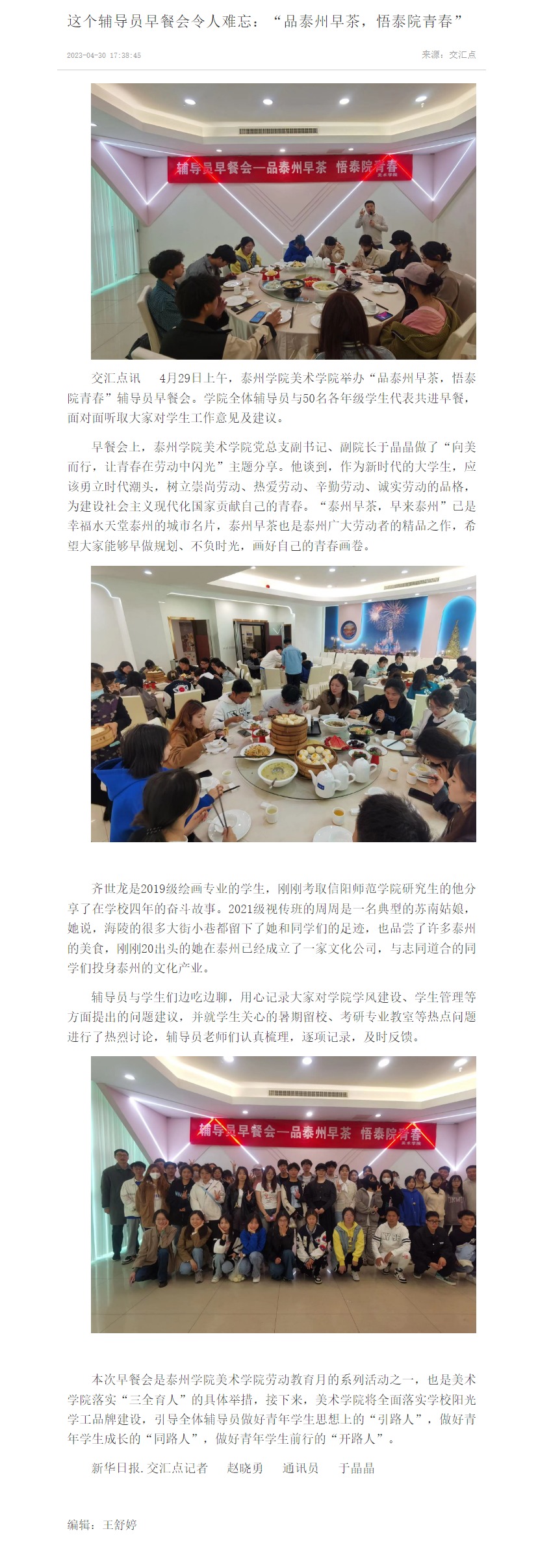 《交汇点新闻》4月30日报道bat365美术学院4月29日举办“品泰州早茶,悟泰院青春”辅导员早餐会,美术学院全体辅导员与50名各年级学生代表共进早餐,面对面听取大家对学生工作意见及建议。报道题为:《这个辅导员早餐会令人难忘:“品泰州早茶,悟泰院青春”》,链接为:https://jnews.xhby.net/v3/waparticles/70/0/YMR7vUe2CkKA24hJ/1