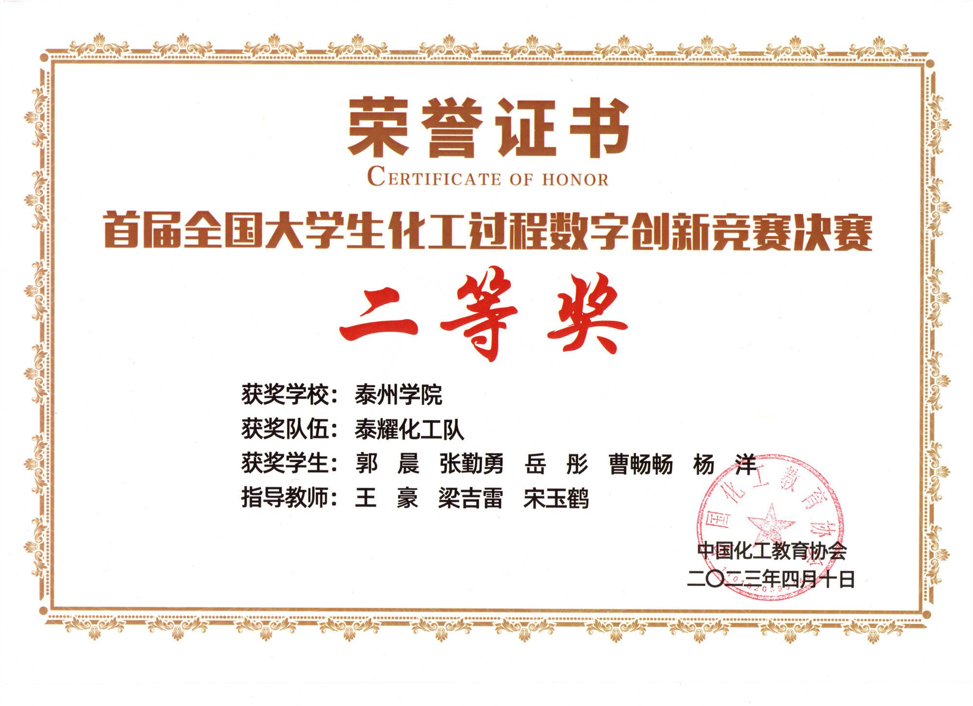 近日,bat365参赛队伍“泰耀化工队”获得首届全国大学生化工过程数字创新竞赛总决赛本科生组二等奖。