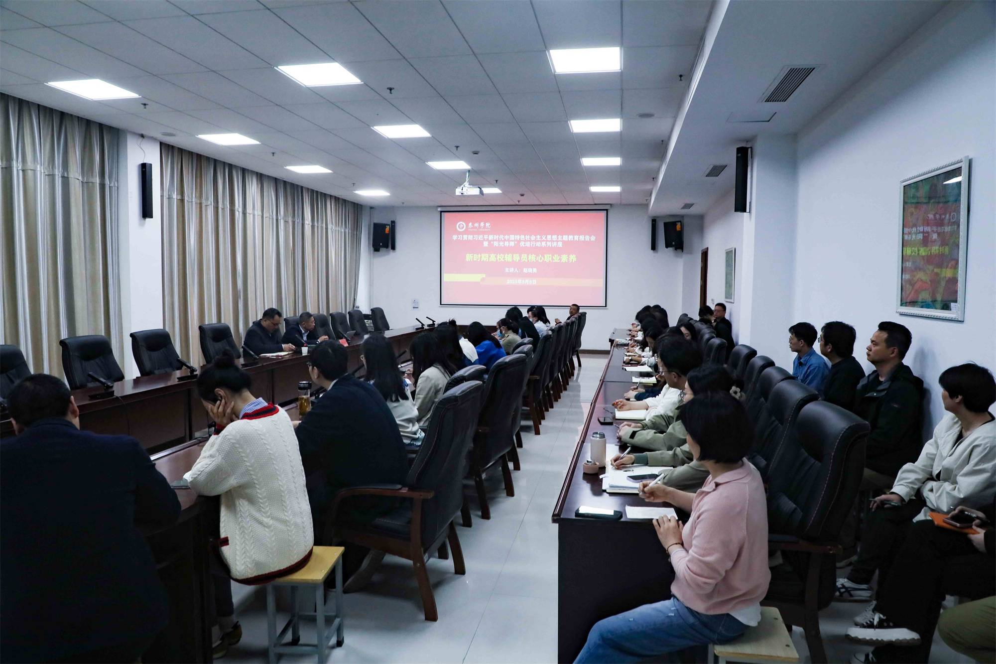 为深入开展学习贯彻习近平新时代中国特色社会主义思想主题教育,进一步加强思想政治工作队伍建设,提高学生工作队伍及思想政治宣传员工作能力与职业素养,5月6日下午,党委宣传部、党委学生工作部、团委联合举办学习贯彻习近平新时代中国特色社会主义思想主题教育之“阳光导师”优培行动系列讲座活动。党委宣传部、党委学生工作部、团委工作人员,各单位教师新闻通讯员及40余名辅导员参加培训。
