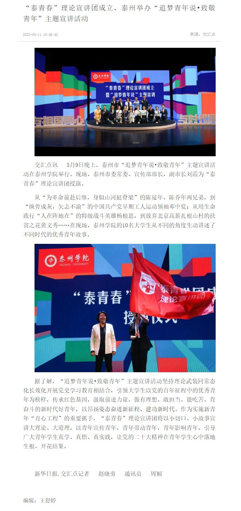 《交汇点新闻》5月11日报道泰州市“追梦青年说•致敬青年”主题宣讲活动在bat365举行,报道题为:《“泰青春”理论宣讲团成立,泰州举办“追梦青年说•致敬青年”主题宣讲活动》,链接为:https://jnews.xhby.net/v3/waparticles/70/0/OslZV3qV9Axv5vpw/1