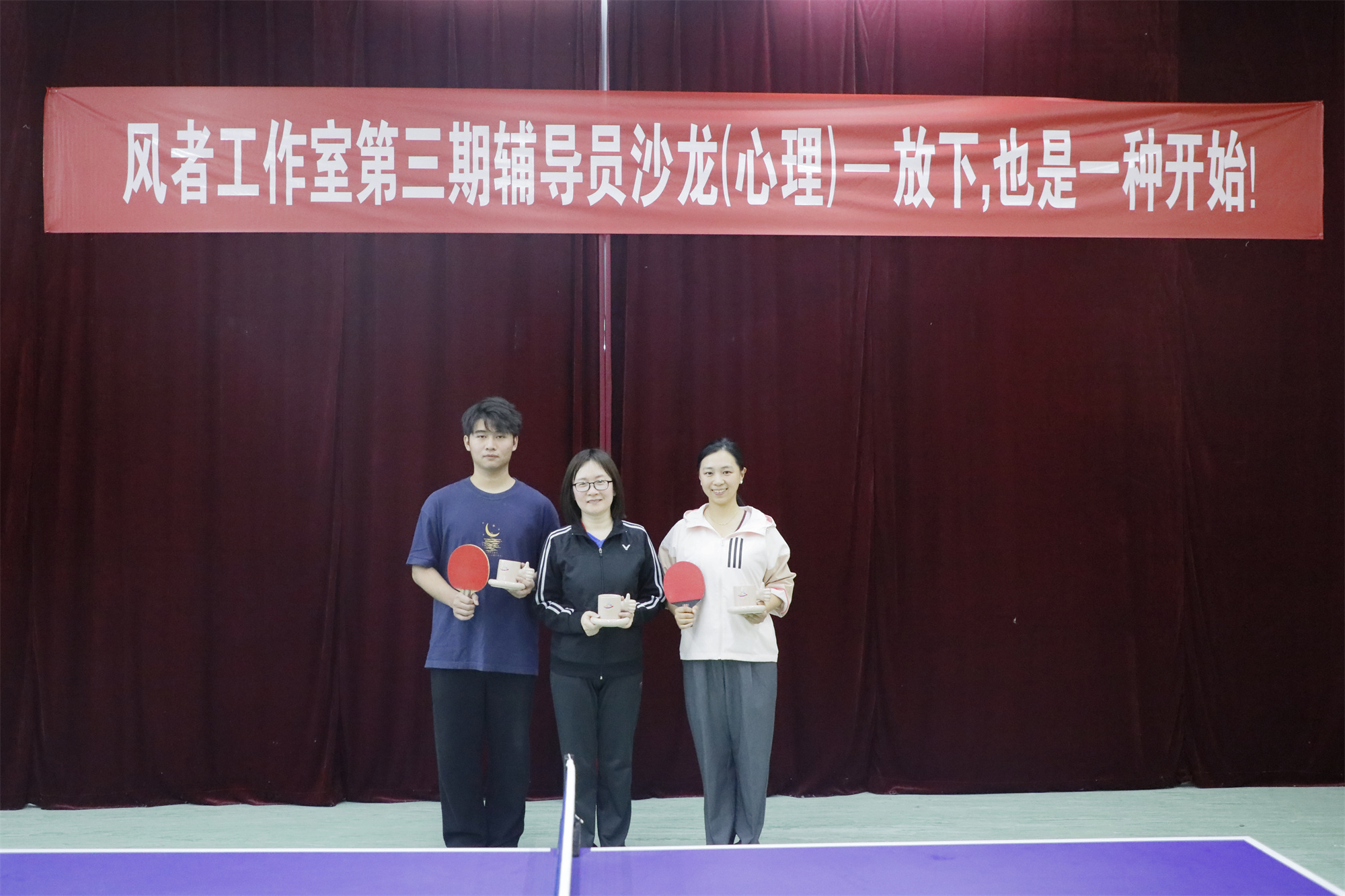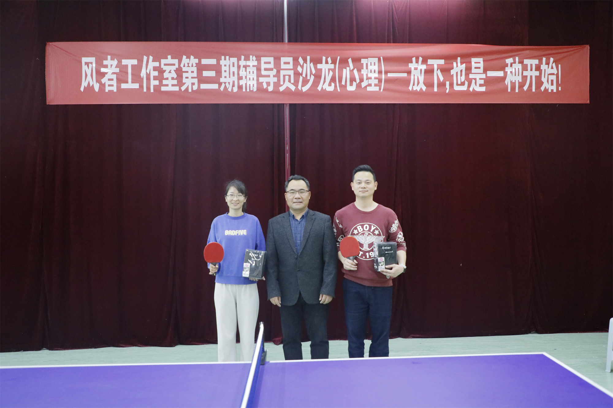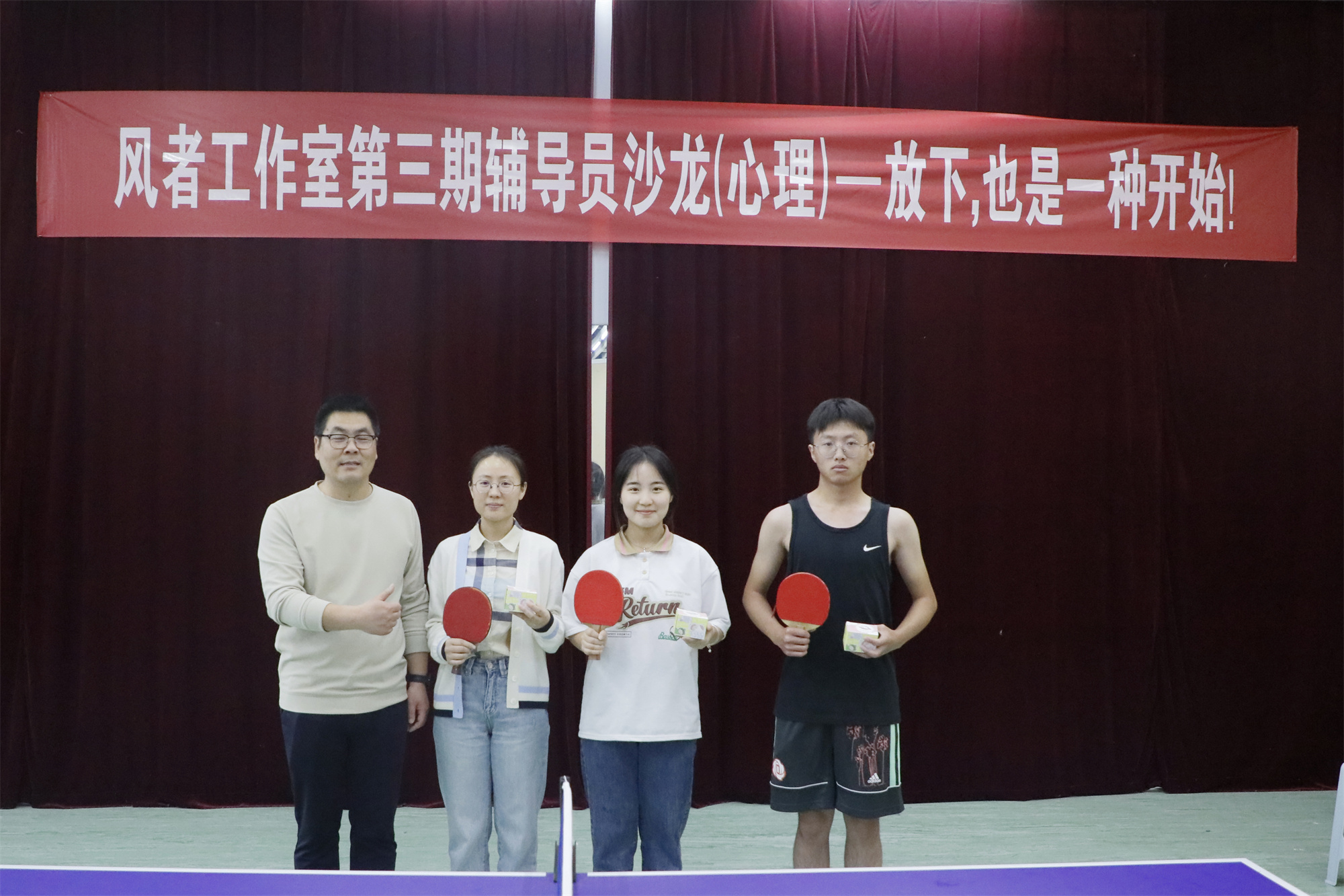 为缓解心理健康工作队伍工作压力,加强辅导员、心理委员自我关爱,减轻助人育人工作中的耗竭感,补充心理能量、赋能自我成长,积极营造崇尚身心健康的校园氛围。5月10日下午,学生工作处心理健康发展中心、风者辅导员工作室在心理健康发展中心B309活动室“阳光运动场”联合举办心理辅导员沙龙活动。本期活动以“放下,也是一种开始”为主题,以乒乓球娱乐赛的形式开展,旨在通过放松的乒乓球运动,为心理健康工作队伍的师生减压放松,补充能量。校党委常委、副校长卜慧芬及学工处负责人,心理健康发展中心工作人员、各学院心理辅导员、年级辅导员及学生心理志愿者代表50多人参加活动。