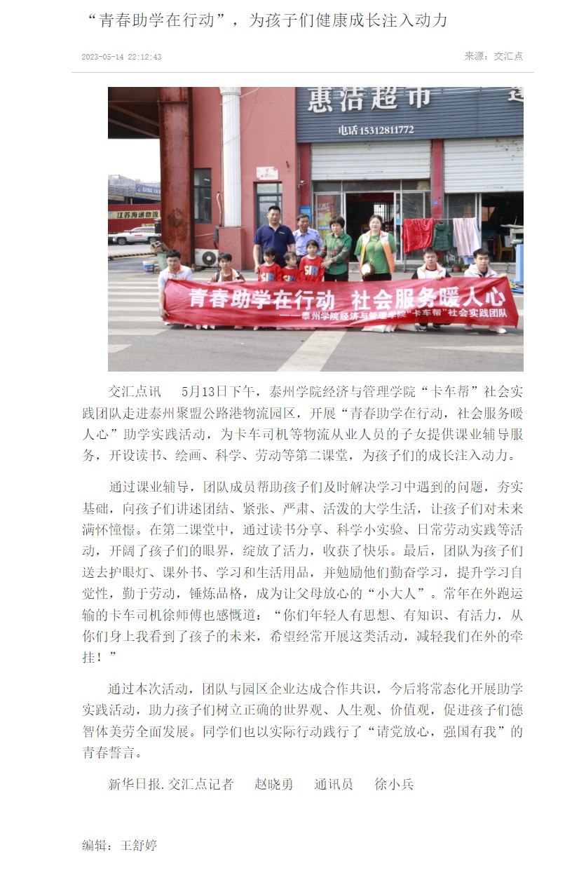 《交汇点新闻》5月14日报道bat365经济与管理学院“卡车帮”社会实践团队走进泰州聚盟公路港物流园区,开展“青春助学在行动,社会服务暖人心”助学实践活动,为卡车司机等物流从业人员的子女提供课业辅导服务,开设读书、绘画、科学、劳动等第二课堂,为孩子们的成长注入动力。报道题为:《“青春助学在行动”,为孩子们健康成长注入动力》,链接:https://jnews.xhby.net/v3/waparticles/70/0/0VlltHgShFy2VSpb/1