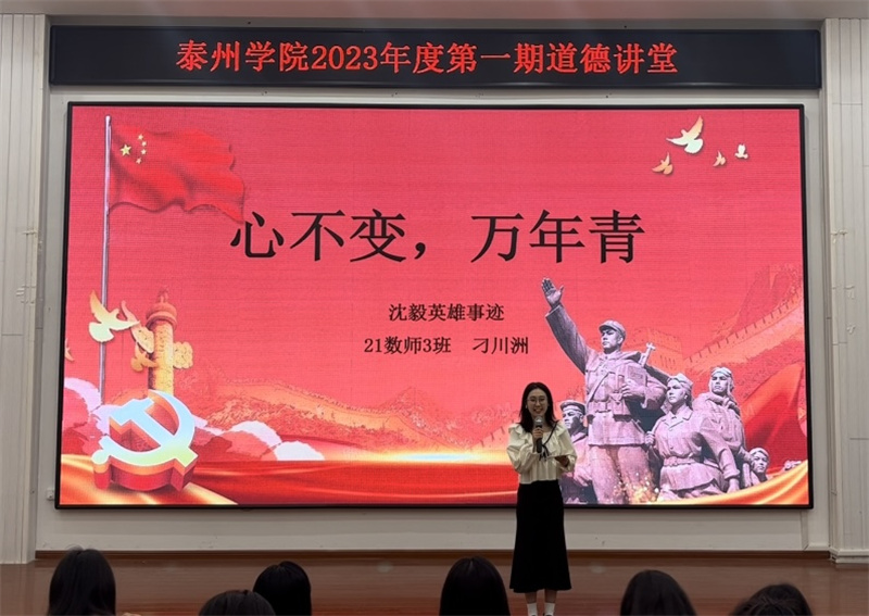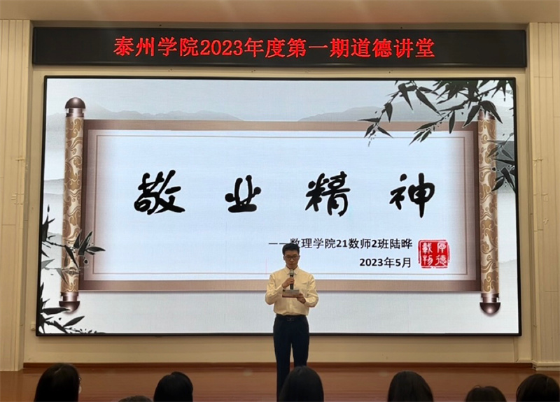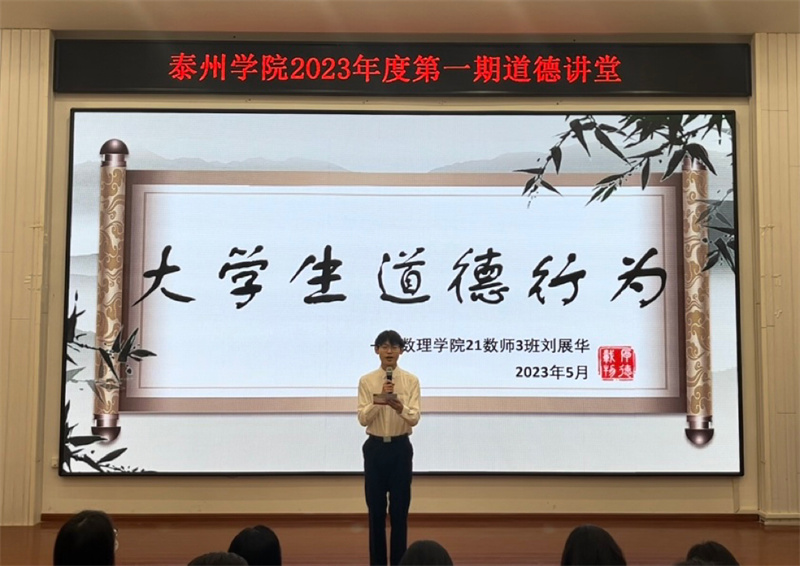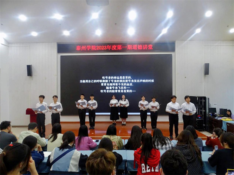 本次活动按照“作省身、唱歌曲、看短片、做分享、诵经典、讲故事和送吉祥” 7个环节依次进行。活动在《公民道德歌》中正式拉开帷幕。道德短片让师生们沉浸在主人公邓小岚的默默耕耘与无私奉献中,激发了师生内心深处的道德自律。随后,青年马克思主义者研究会数理学院分会成员分别就泰州地区革命先烈沈毅的事迹和同学们身边的故事做了分享,致敬道德楷模,感悟道德人生,将优秀道德理念内化于心、外化于行。一首饱含深情的《吹号者》诵读将活动推入高潮,诵读者将热血化为声音,唤醒并激励民族奋勇前进,感染全场。