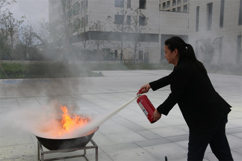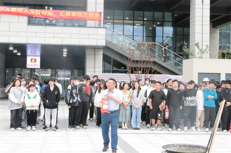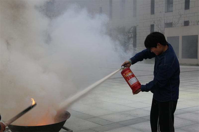 灭火实战演练环节,陈根怀讲解了火灾的种类、灭火器的使用方法等消防安全知识,并演示如何扑灭初期火灾。学生代表和食堂员工代表分批开展了灭火实战演练。