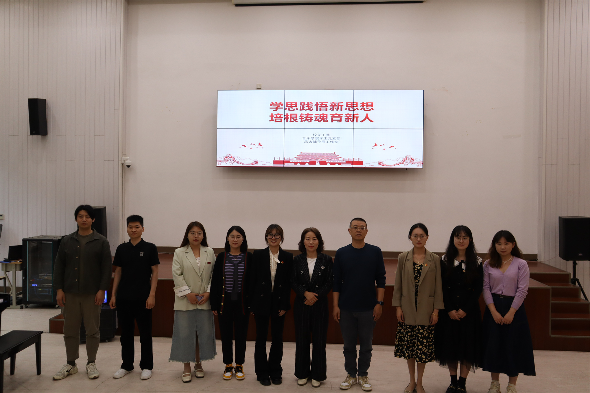 为深入学习贯彻习近平新时代中国特色社会主义思想,充分发挥辅导员沙龙平台的育人功能,加强青年师生思想政治工作,5月24日下午,风者辅导员工作室与校关工委、音乐学院学工支部在艺术楼合唱教室联合举办以“学思践悟新思想,培根铸魂育新人”为主题的辅导员沙龙活动。校关工委常务副主任徐金城,副主任代表、秘书长,音乐学院党总支书记刘江元,学生工作处部分工作人员,各学院辅导员代表,音乐学院师生党员代表等40多人参加活动。活动由青年辅导员王尚文主持。