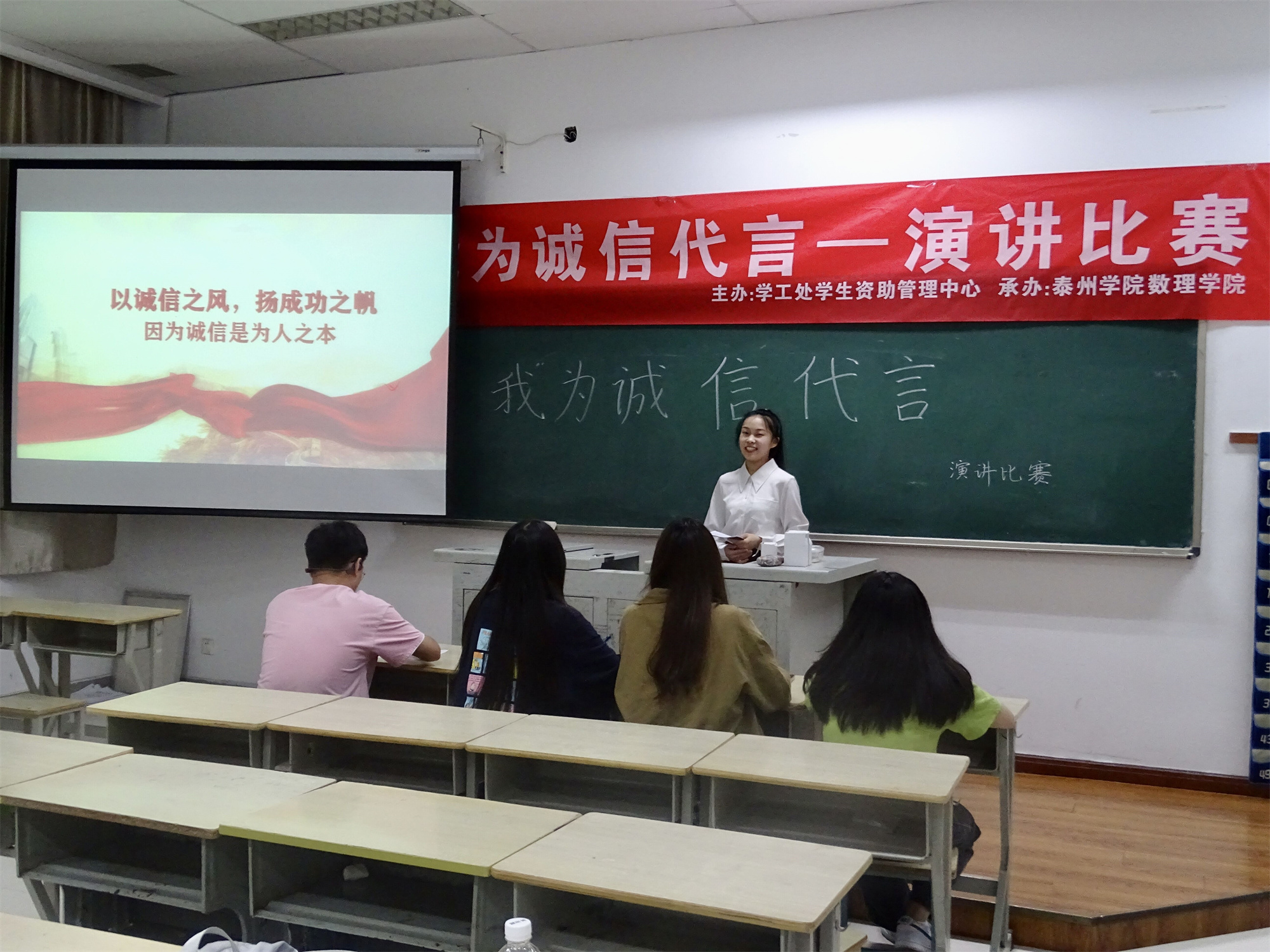 为弘扬中华优秀传统美德,培育和践行社会主义核心价值观,加强学生的诚信教育,6月2日,由学工处学生资助管理中心主办、数理学院承办的“我为诚信代言”主题演讲比赛在教学楼A1102举办。