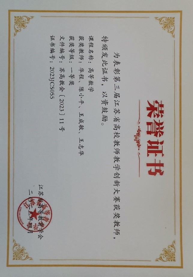 近日,江苏省高等教育学会公布了第三届江苏省高校教师教学创新大赛结果,bat365数理学院华程、陈小平、王成敏和王志华四位教师参赛的课程《高等数学》荣获一等奖,实现了bat365在高层次高水平教师教学竞赛的突破。