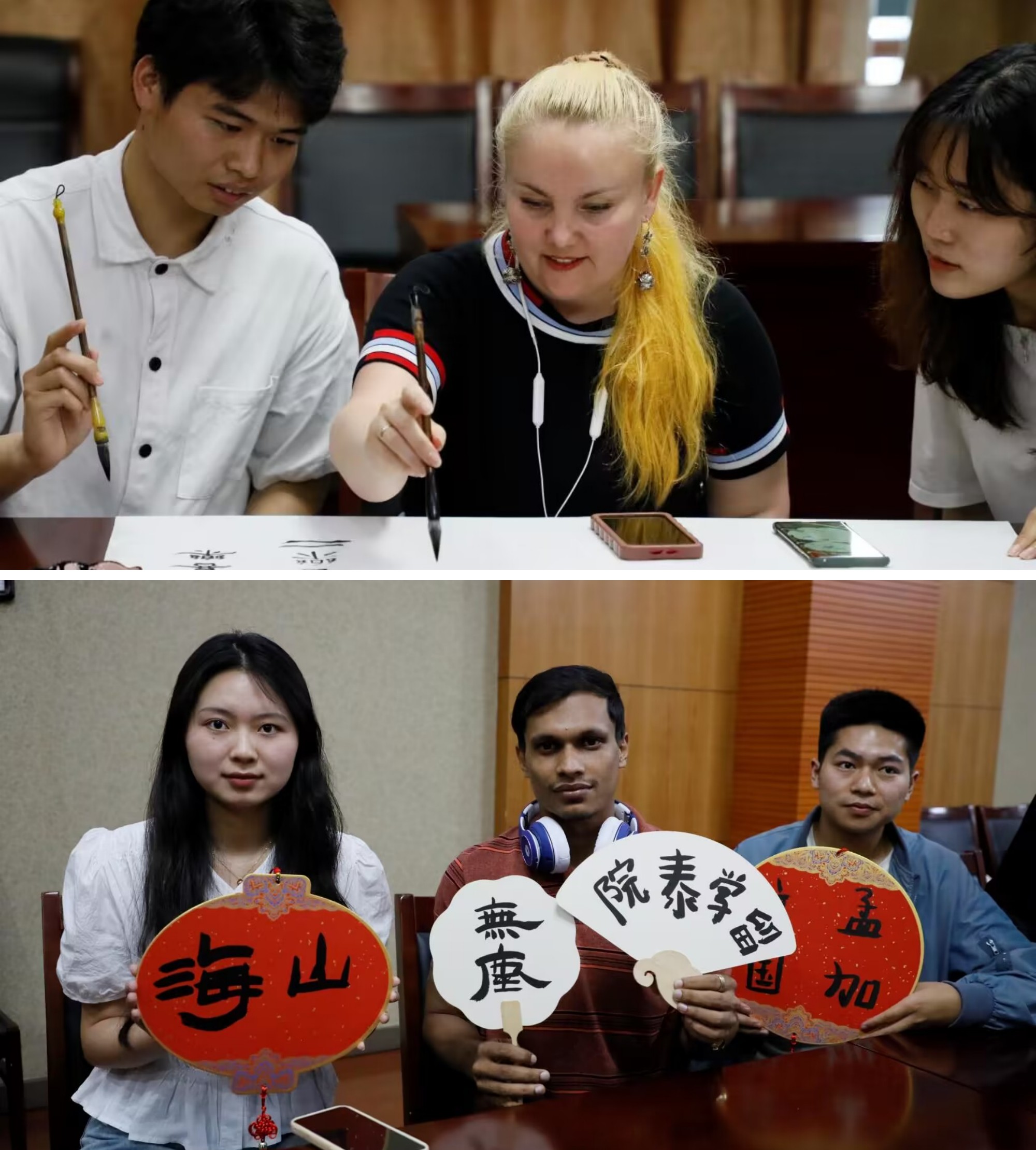 书法专业的学生向外教和留学生们介绍了笔墨纸砚、握笔姿势、书写笔法和技巧,在他们的耐心指导下,外籍师生执笔、蘸墨,对照着书法作品进行临摹,并展示学习成果。大家纷纷表示,自己特别喜欢中国的书法和文化氛围,通过书法感受到了中国文化的博大精深。