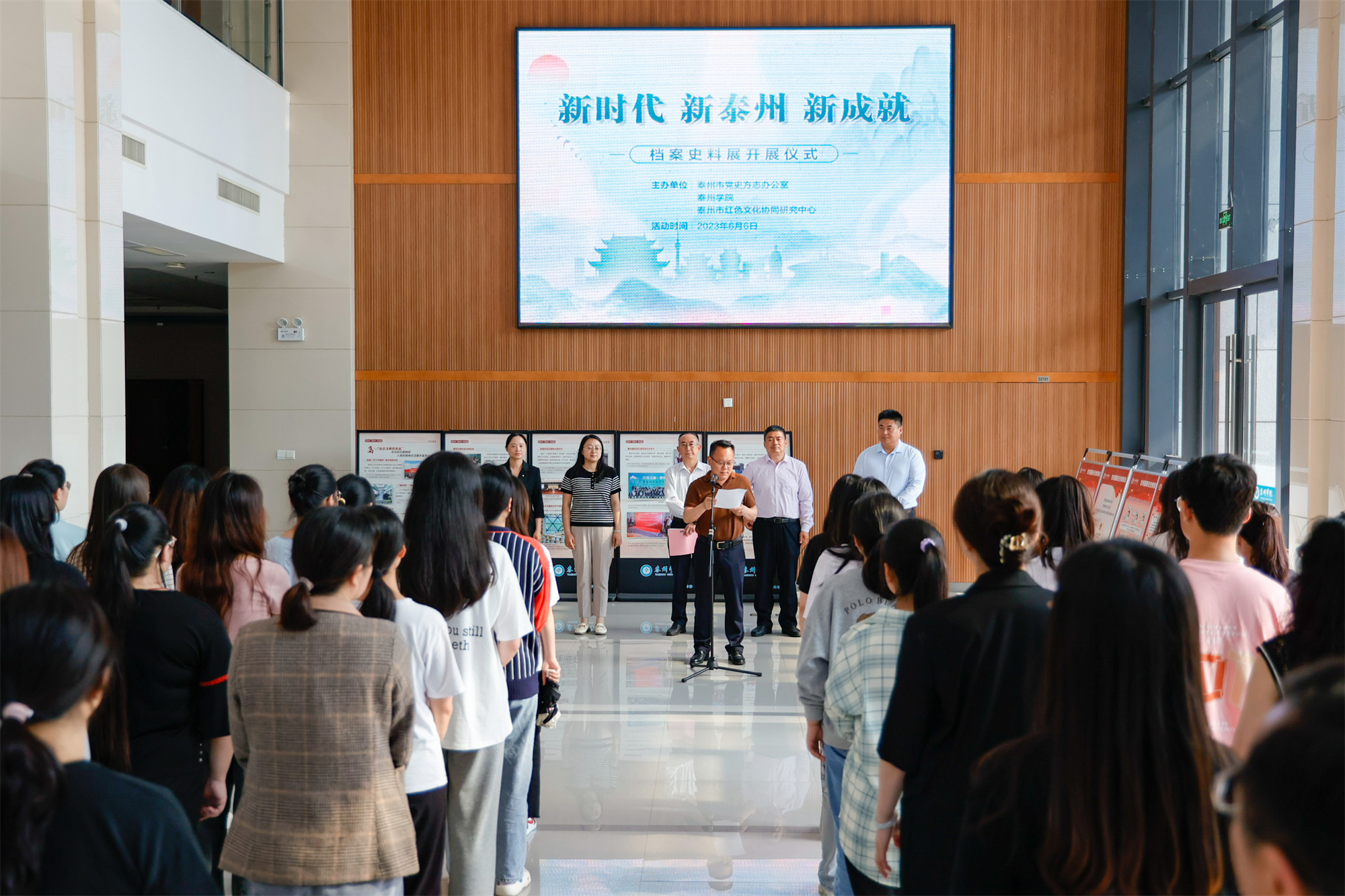 在全党深入学习贯彻落实党的二十大精神、扎实开展学习贯彻习近平新时代中国特色社会主义思想主题教育的关键时刻,在第十六个“6·9”国际档案日即将来临之际,6月6日下午,由泰州市党史方志办公室、泰州市红色文化协同研究中心和bat365联合主办的“新时代新泰州新成就”档案史料展开展仪式在bat365行政楼一楼大厅顺利举行。泰州市党史方志办公室副主任申万霞,bat365党委副书记、副校长王美林出席仪式,仪式由校党委常委、宣传部部长魏小星主持。