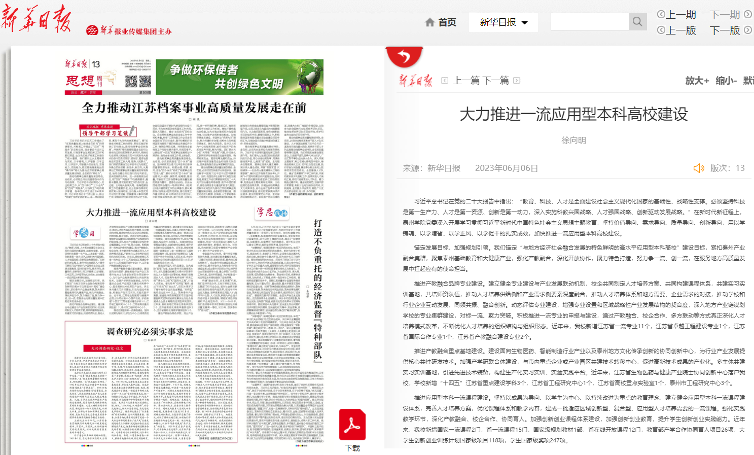 《新华日报》6月6日刊登校党委书记徐向明署名文章《大力推进一流应用型本科高校建设》。