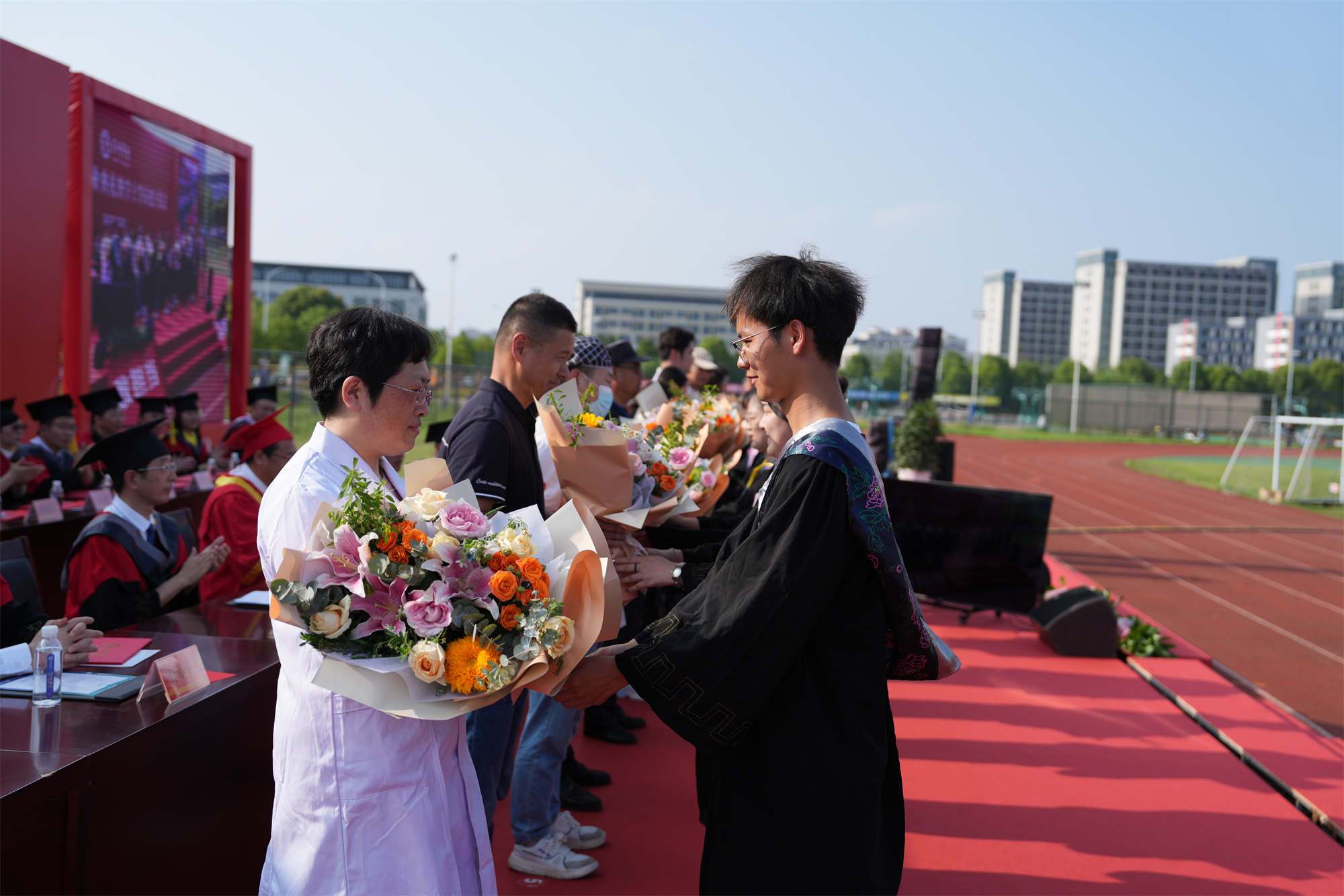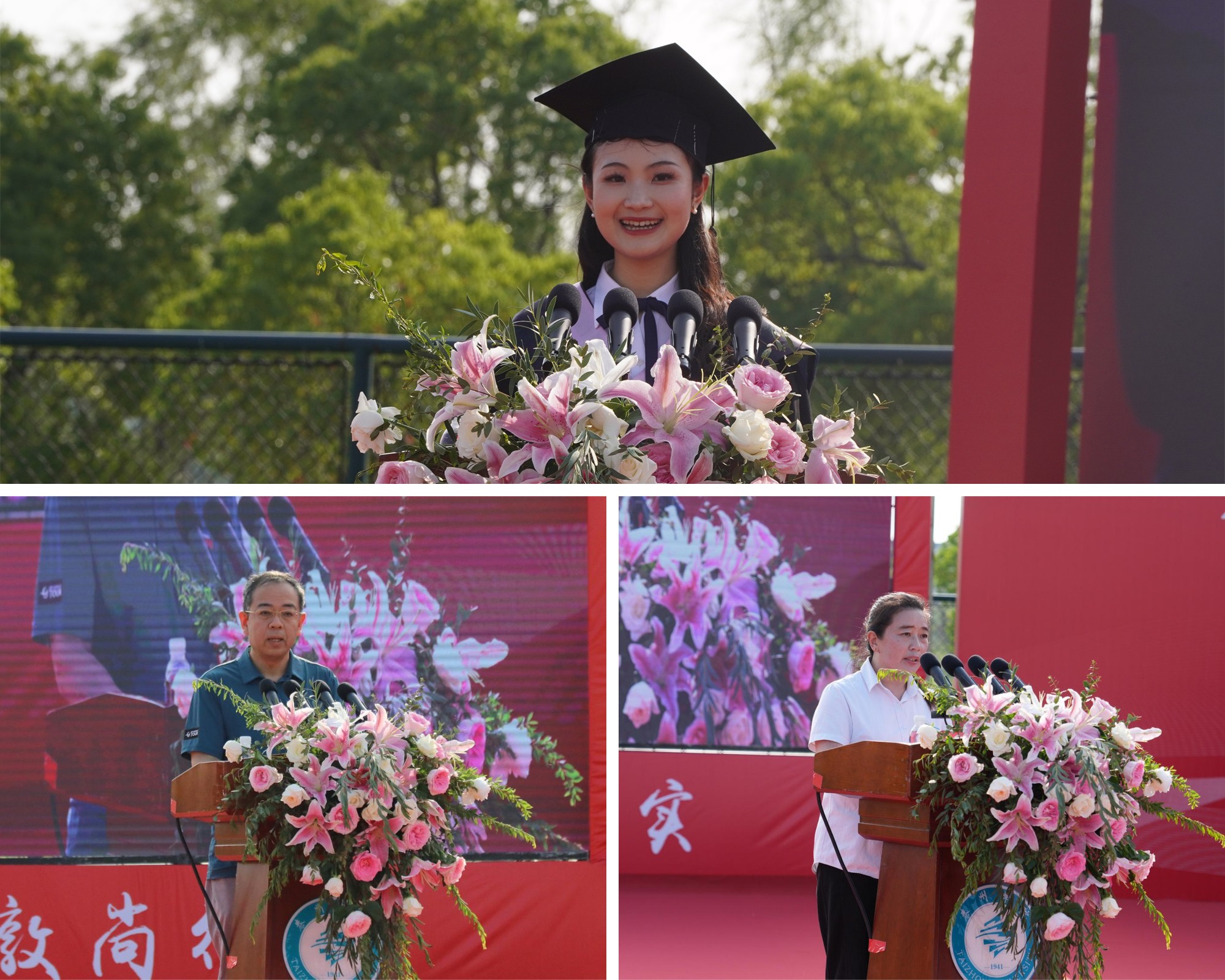 在“成长·奋进”篇章,教育科学学院的陈方劼元同学作为毕业生代表发言,她分享了个人成长经历,表达了对母校的依依不舍和感激之情,并代表全体毕业生承诺将继续牢记“敦尚行实、明体达用”的校训,用泰院精神指引新的奋进旅程。高教后勤新公寓宿管员陈亚琴作为职工代表发言,为毕业生送上真挚的祝福。信息工程学院任向民教授作为教师代表发言,他希望同学们做一个有正确的世界观、人生观和价值观的人;做一个敢于创新,勇于实践,会学习的人;做一个懂得感恩的人。在感恩祝福环节,毕业生为一路相伴、辛勤劳作的教职工代表、家长代表献花,表达谢意。
