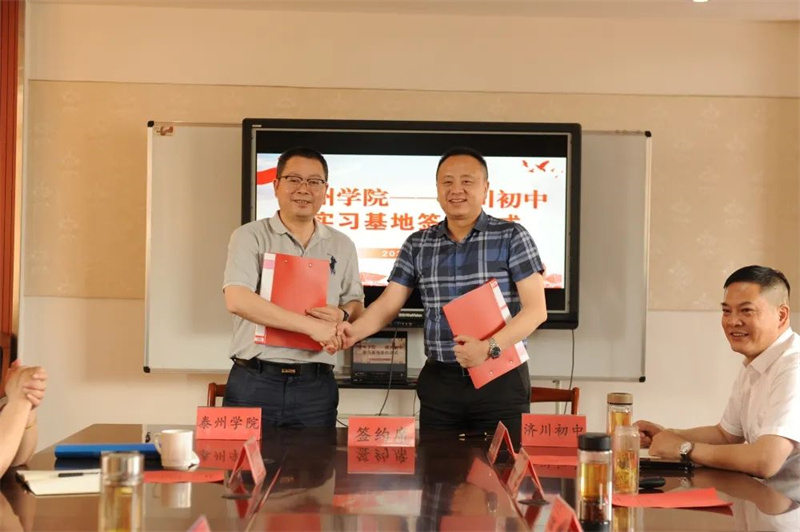 为进一步落实泰州市委市政府教育优先发展的新部署新要求,拓宽高校育人渠道,6月12日,人文学院与泰兴济川初中教育集团举行了实践教学基地签约及揭牌仪式。人文学院党总支书记李中明等一行四人赴济川初中交流。泰兴市教育局副局长游洋,济川初中教育集团联合党总支书记、总校长陈辉等参加了签约、揭牌仪式。