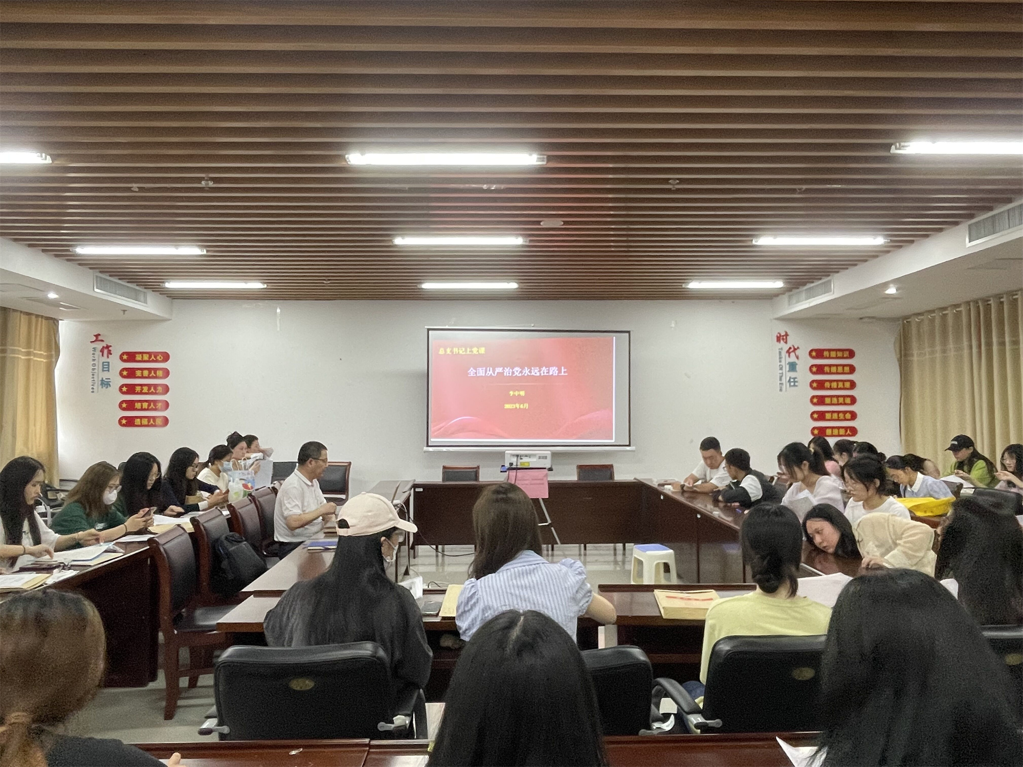 为端正毕业生党员的思想态度,提高先锋服务意识,人文学院党总支书记李中明于6月19日下午在D2401为学工第一、第二党支部毕业生党员上以“全面从严治党永远在路上”为主题的党课。