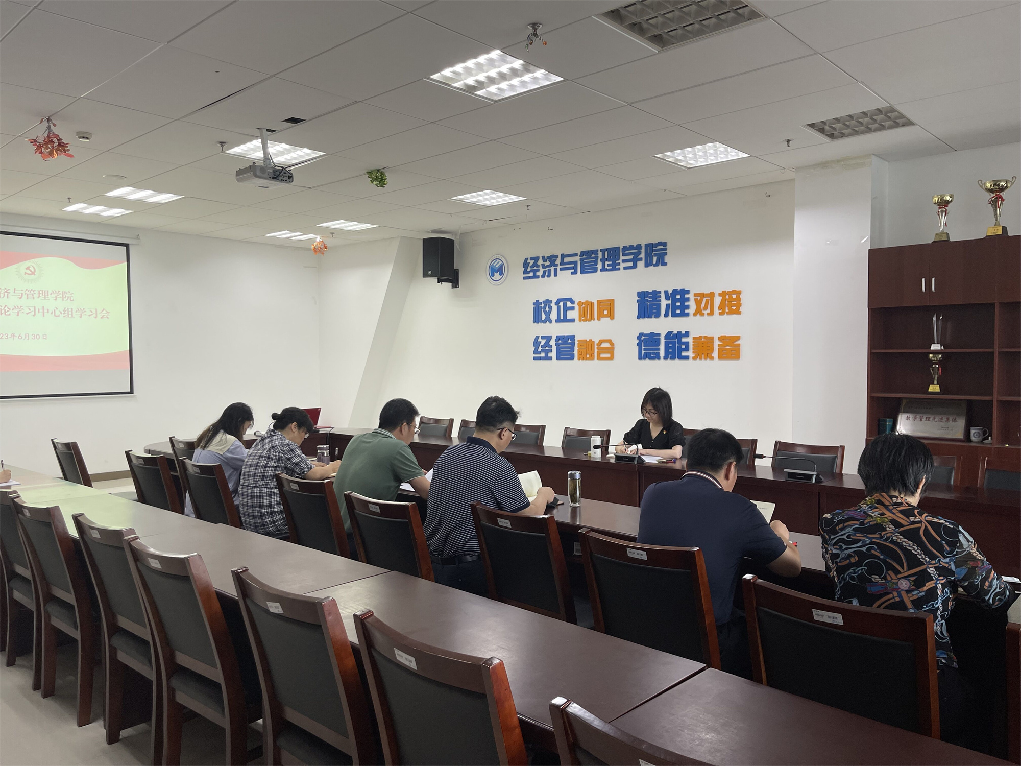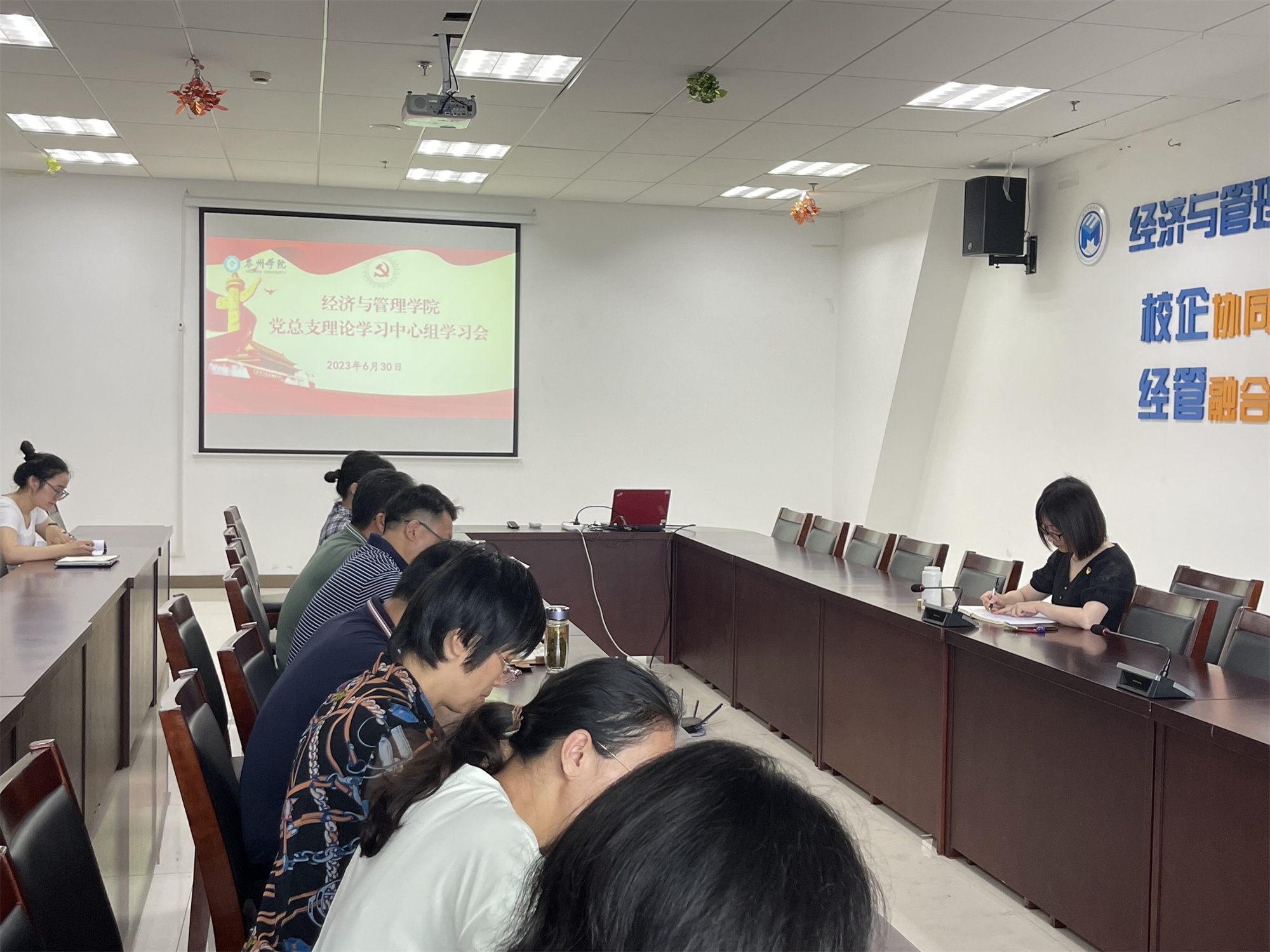 6月30日上午,经济与管理学院党总支召开理论学习中心组学习会议,校党委常委、副校长卜慧芬到会巡学旁听,院党总支理论学习中心组成员参加学习会,会议由学院党总支书记刘荣江主持。