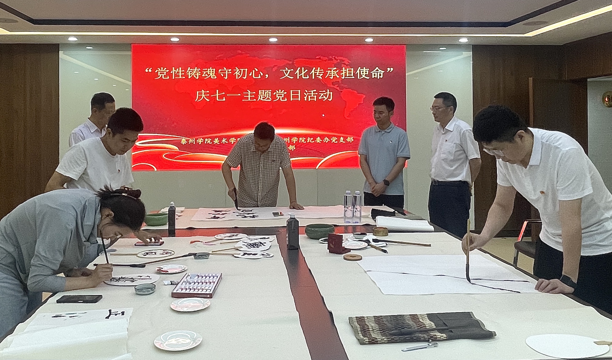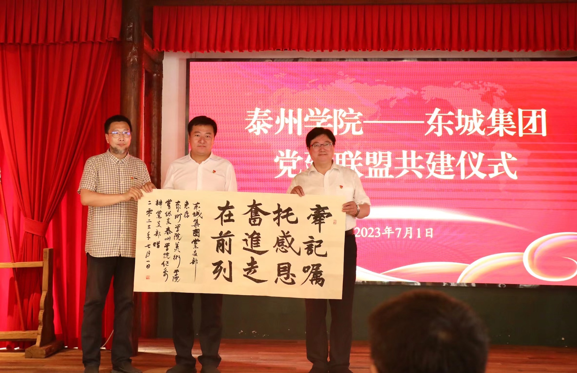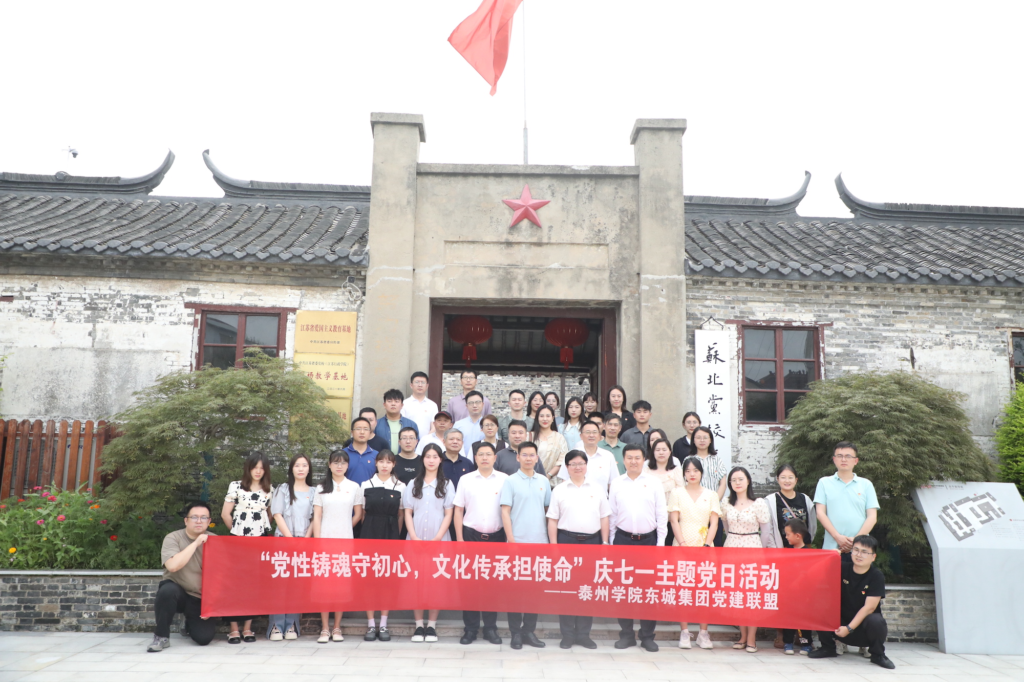 本次党日活动共分重实践、强党性、学思想、建新功四个模块。7月1日上午,美术学院、纪委办党员师生赴东城集团开展“书画艺术进企业”志愿服务实践活动,通过现场书画艺术创作传播中华优秀廉洁文化。下午,三方党员共赴苏北党校旧址开展党建联盟共建活动:“强党性”环节,全体党员集体参观了苏北党校旧址,东城集团党支部书记、董事长黄亮带领全体党员重温入党誓词,部分党员代表参加重读入党志愿、重忆入党经历、重问入党初心等活动交流成长感悟;“学思想”环节,校纪委书记何军以《学习党章党规党纪 坚决全面从严治党》为题给全体党员上专题党课,东城集团党支部副书记、总经理姜军领学了习近平总书记在文化传承发展座谈会上的讲话精神;“建新功”环节,各党组织围绕学习贯彻习近平新时代中国特色社会主义思想主题教育,结合单位实际分别组织了“牢记嘱托、感恩奋进、走在前列”大讨论。