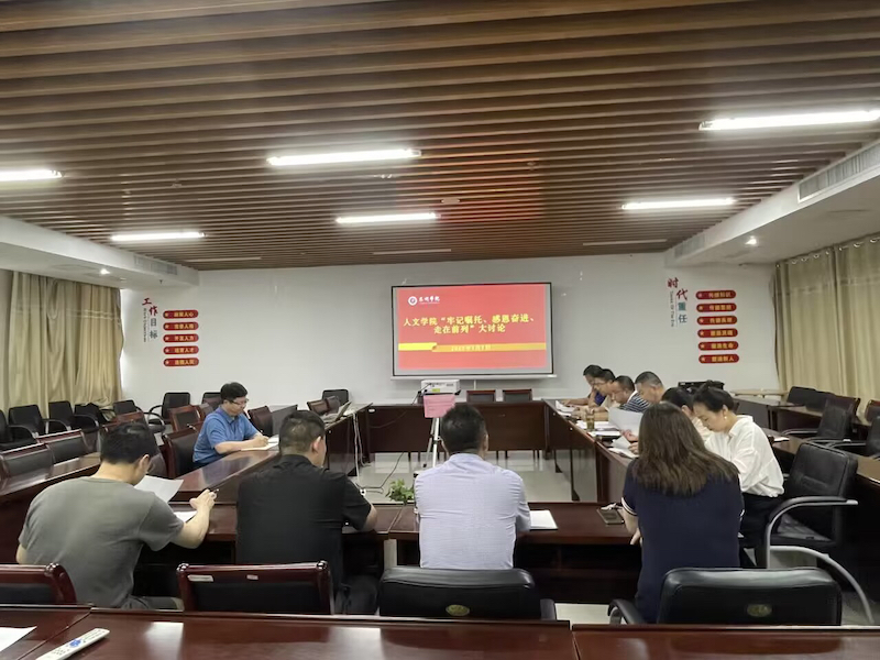 7月7日下午,人文学院党总支在行政楼D2401开展“牢记嘱托、感恩奋进、走在前列”大讨论。校党委常委、纪委书记何军出席会议。会议由学院党总支书记李中明主持,院党总支理论学习中心组成员、科级以上干部、各党支部书记、各系主任及教师代表参加了大讨论。
