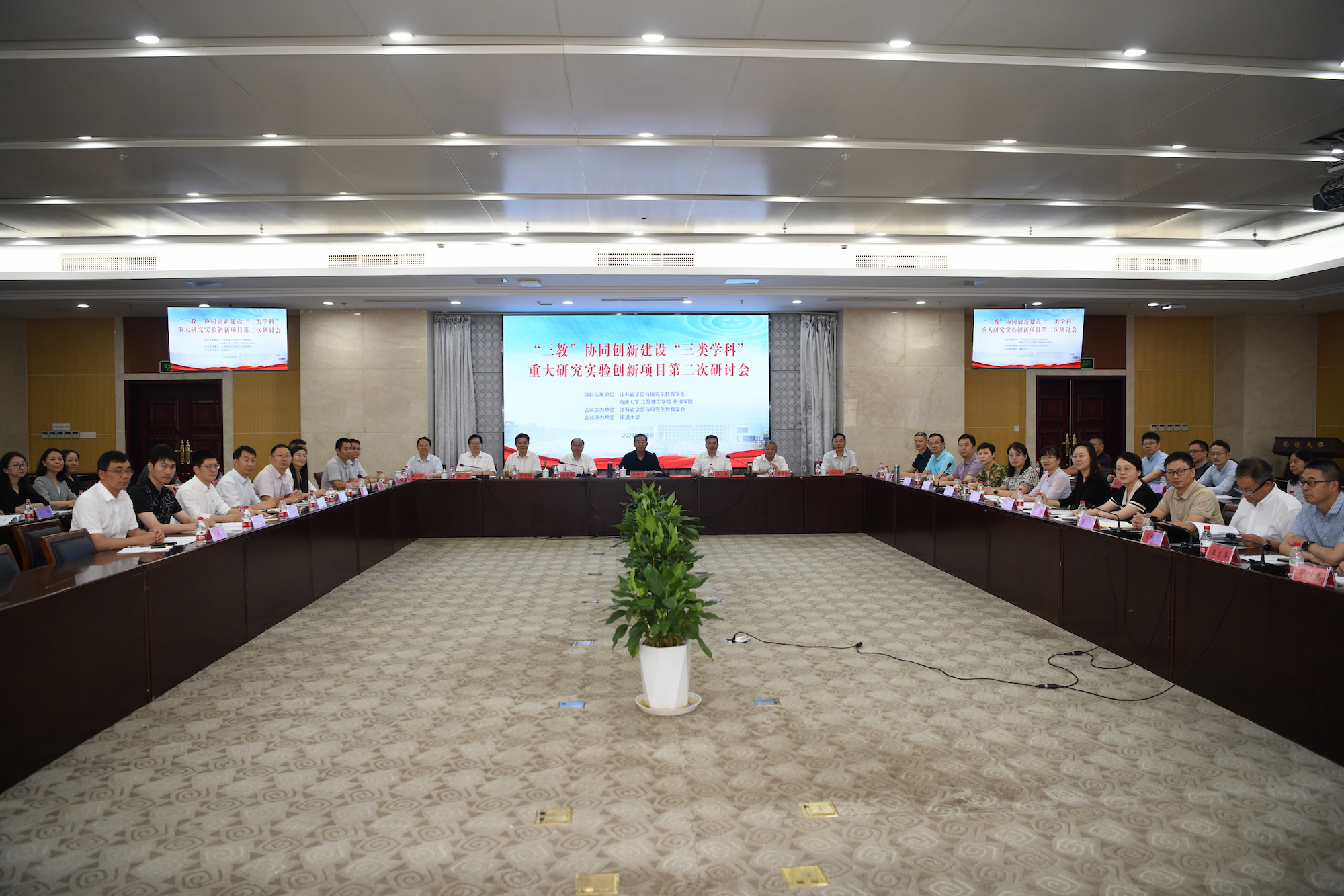 7月8日,校党委副书记、校长季赛,党委常委、副校长薛小平,信息工程学院、教育科学学院、医药与化学化工学院负责人,教师代表和科研处相关人员一行参加了在南通大学举办的江苏省学位与研究生教育学会《“三教”协同创新建设“三类学科”重大研究实验创新项目》第二次研讨会。江苏省学位与研究生教育学会会长殷翔文,秘书长储宪国,南通大学党委副书记、校长杨宇民,江苏理工学院党委副书记、校长戴国洪,南通大学党委常委、副校长施佺,江苏理工学院副校长谢忠秋出席会议。