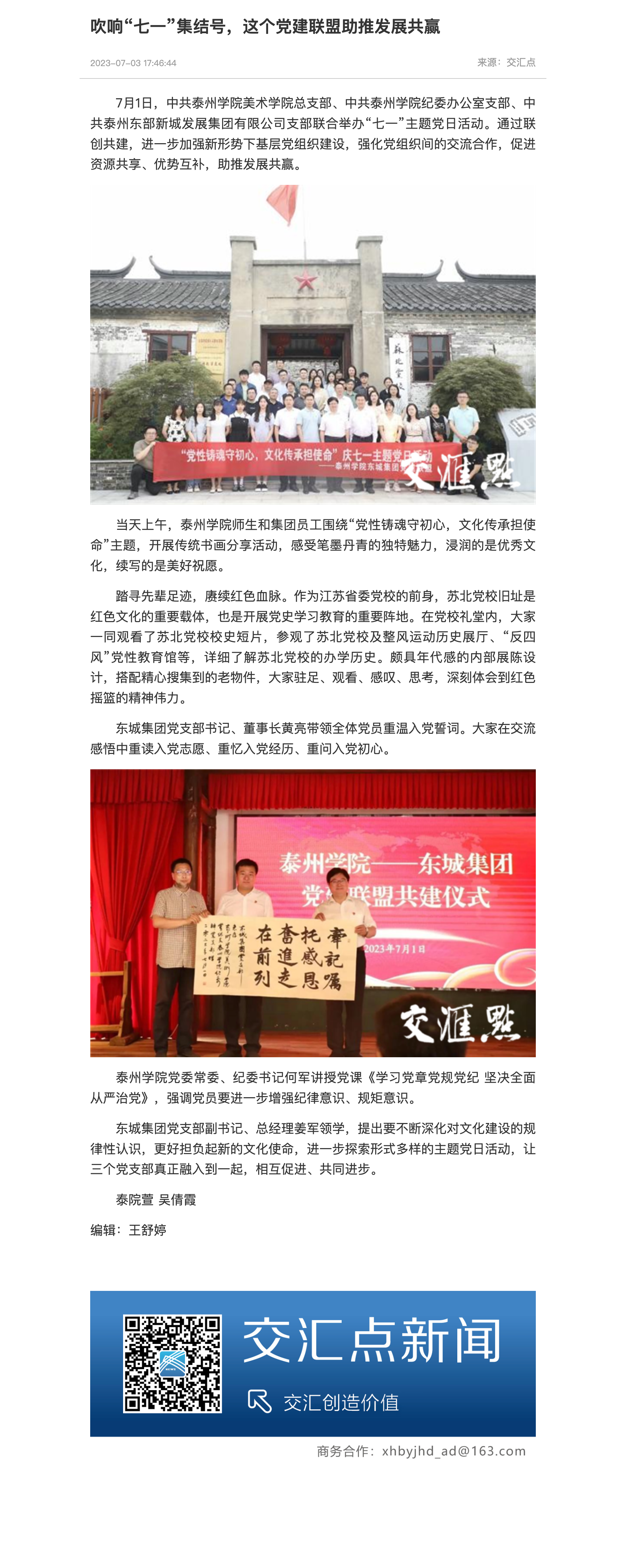《交汇点新闻》7月3日报道bat365美术学院党总支、中共bat365在线中国官网登录入口纪委办公室支部、中共泰州东部新城发展集团有限公司支部联合举办“七一”主题党日活动。通过联创共建,进一步加强新形势下基层党组织建设,强化党组织间的交流合作,促进资源共享、优势互补,助推发展共赢。报道题为:《吹响“七一”集结号,这个党建联盟助推发展共赢》,链接:https://jnews.xhby.net/v3/waparticles/40b0f14a6b4f49a794c7efad90ce3c3c/0/zIjOdNgTGNbg8yiv/1