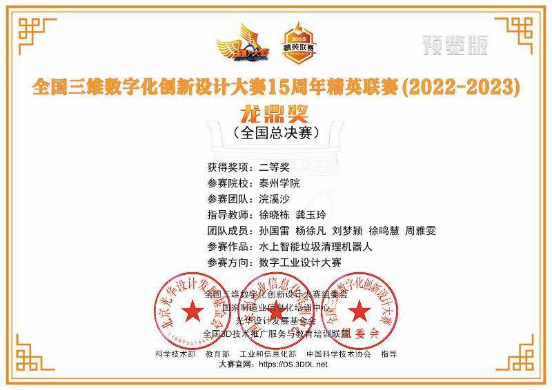 近日,全国3D大赛15周年精英联赛(2022-2023)总决赛榜单公布,bat365机电工程学院孙国雷、杨徐凡、刘梦颖、徐鸣慧、周雅雯等同学的参赛作品《水上智能垃圾清理机器人》(指导老师:徐晓栋、龚玉玲)荣获二等奖。